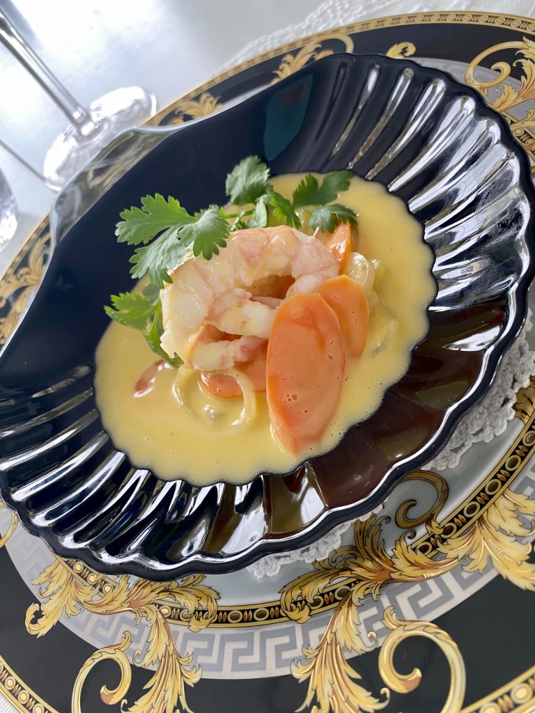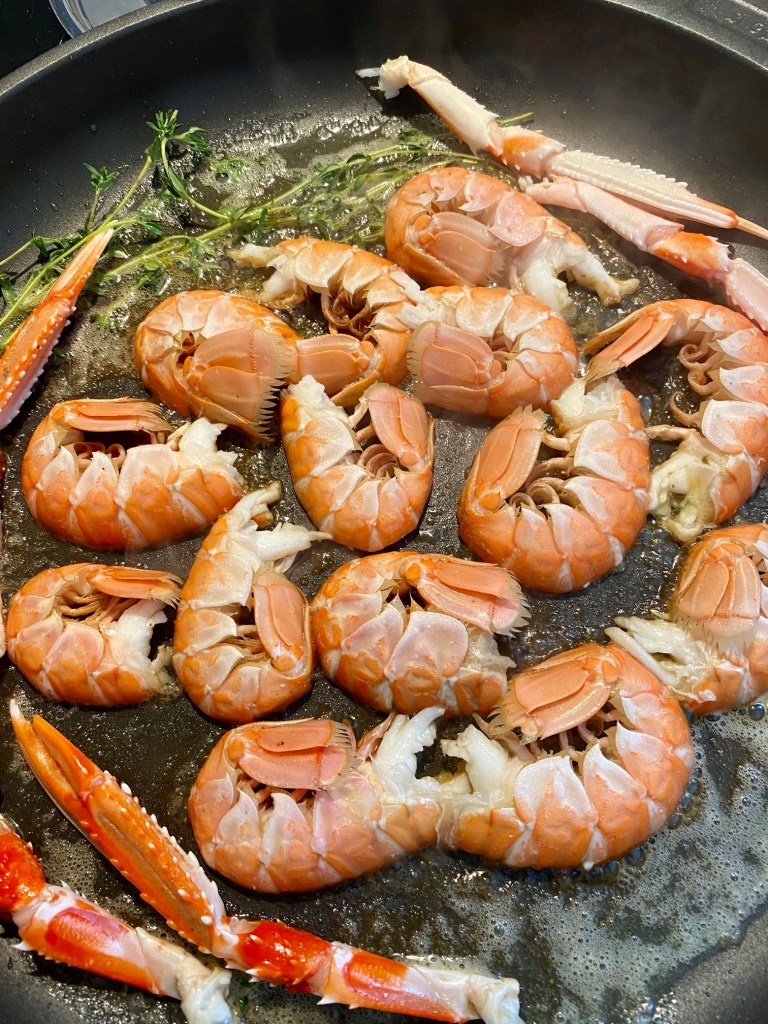 Utgangspunktet for at denne sausen ble testet, var at Fisketorget Stavanger hadde fersk sjøkreps, og den Danske Gourmetkokk Jens Peter Kolbeck hadde oppskriften i sin siste kokebok..Sølvræven… Sausen er enkel å lage, og kalles «Sauce Nage» på fagspråket, kan tilberedes på forhånd, bare å piske inn smøret og smake den til rett før servering.. Sausen passer til hvit fisk, reker,stekt scampi, og som her sjøkreps.. Dette er ikke betalt reklame, jeg hendviser bare til kokebok og fiskehandler, begge deler tilfører meg fremragende service og inspirasjon.