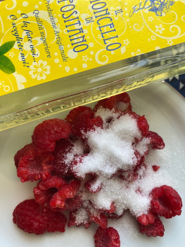 Min bringerbær topping består av 75 gram bær, 1 sps sukker pluss 1 sps sitronlikør, klem bringebær med en gaffel, tilsett sukker og sitronlikør, eller sitronsaft.. jeg hadde litt blåbær og mango i kjøleskapet.. bruk det du har.. jordbær smaker også utmerket til.