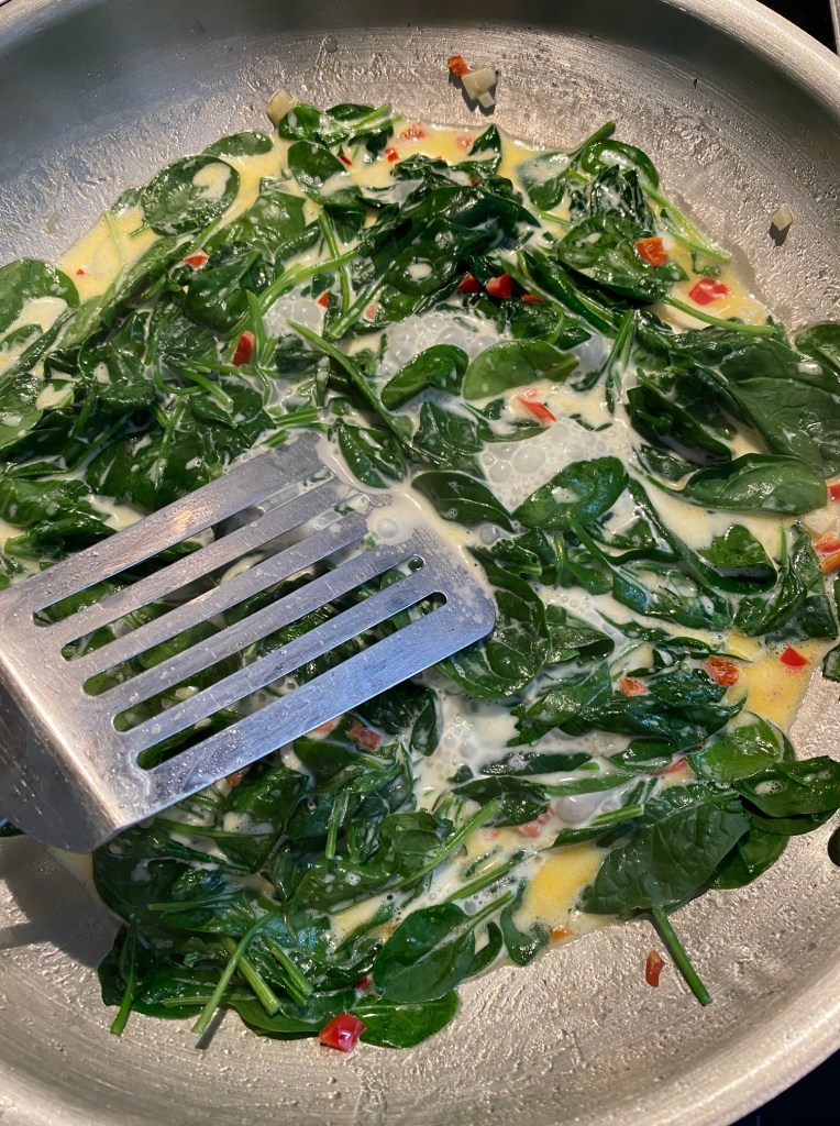 Hakk hvitløk, pluss chili og champinjong. Brun sopp og legg tilsides, smelt smør og tilsett hvitløk og chili, la dette mykne på svak varme, tilsett hvitvinen og reduser inn til halvparten, etter redusering av dette tilsettes fiskekraft og fløte, gi et oppkok, ha så i spinat og småkok dette til spinaten smelter inn.. før servering tilsettes den ferdigstekte champinjong. Smak til med salt og pepper .. men vær obs på at kreps har mye smak.