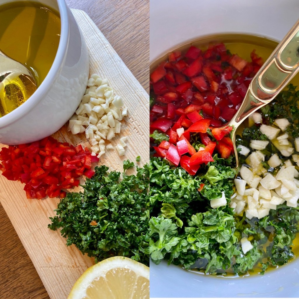 - Skrell og hakk hvitløken, hakk chili, kjør alt i en blender sammen olivenolje, persille og sitronsaft.