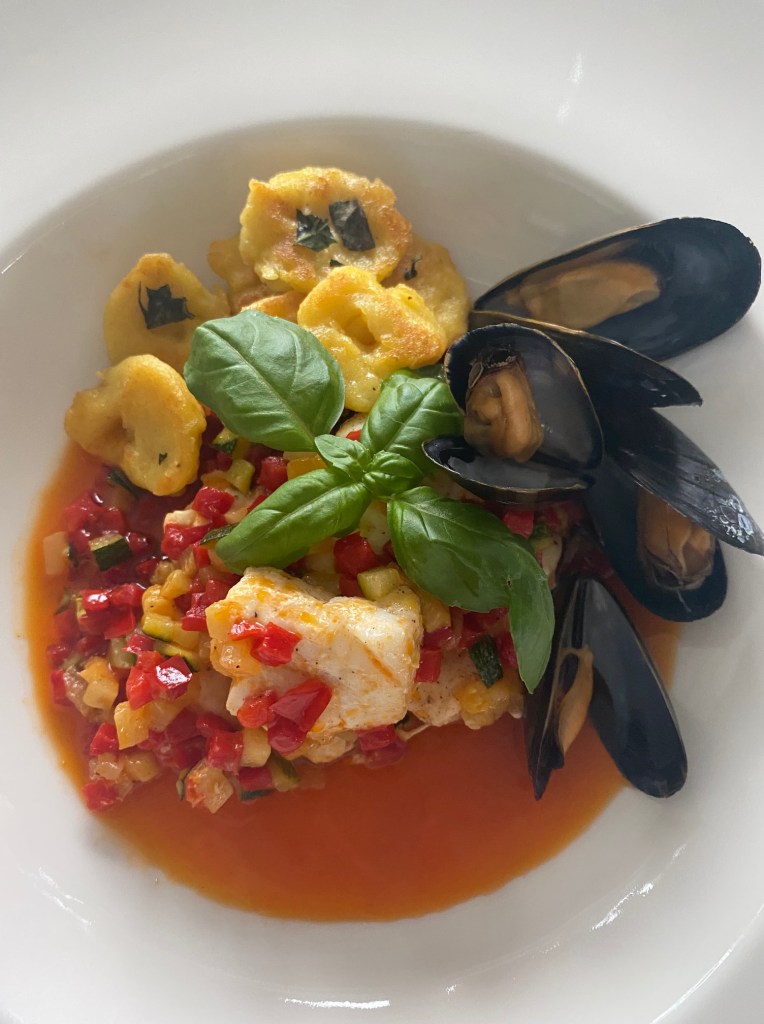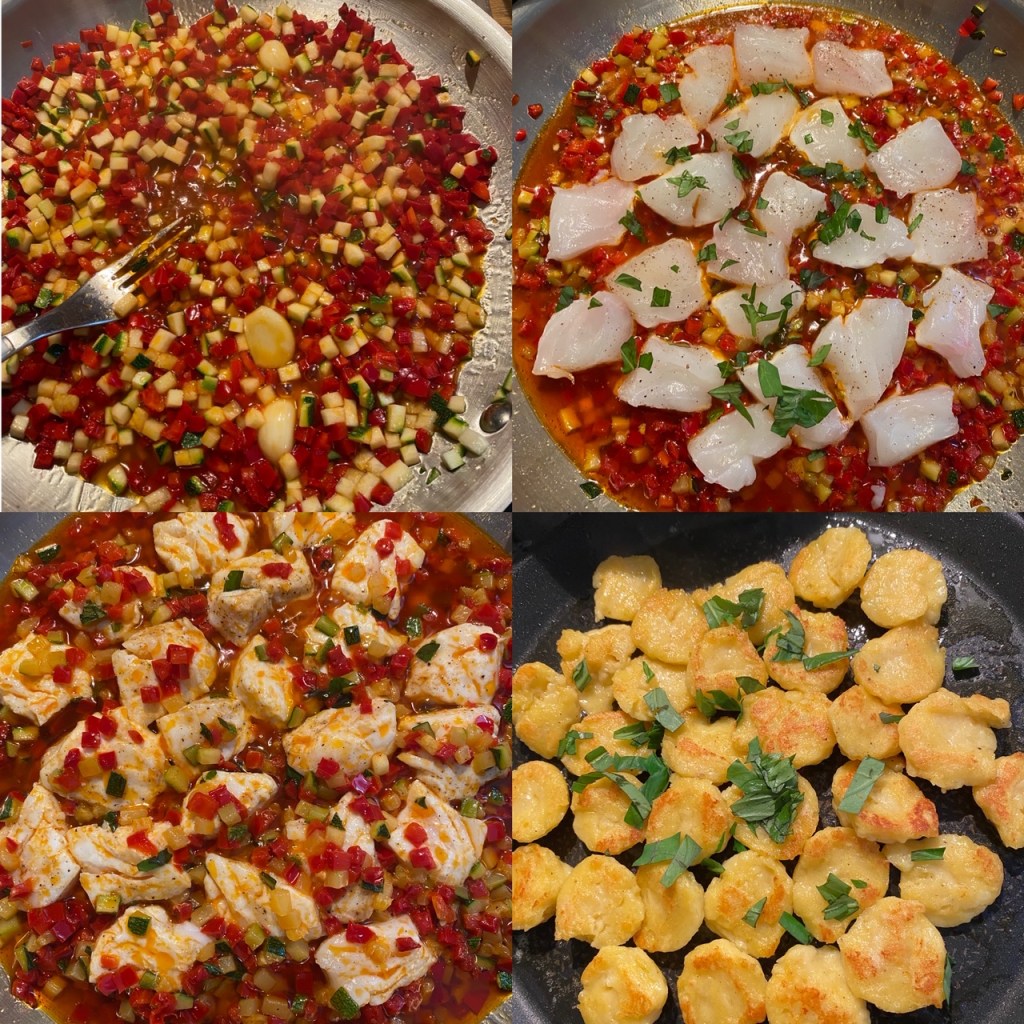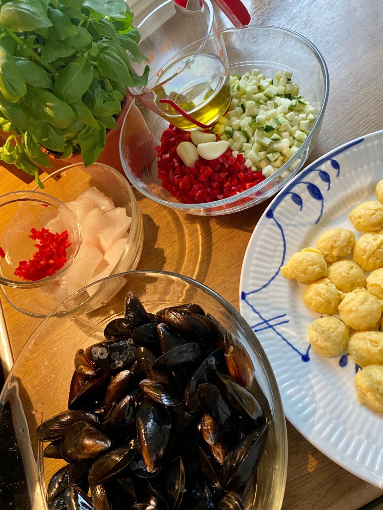 Denne fiskeretten ble til etter inspirasjon fra fantastiske Amalfi kysten i Italia. Hadde ingen oppskrift, har prøvd meg litt frem, og resultatet ble bra… Den er enkel, mye kan forberedes i god tid.. her servert med gnocchi, men passer også utmerket sammen med pasta.. Smakfull og god.. fisk er valgfritt, jeg har brukt kveite som er vår favorittfisk.. Hadde også ferske blåskjell som tillegg, de kan sløyfes, bruk det du har.