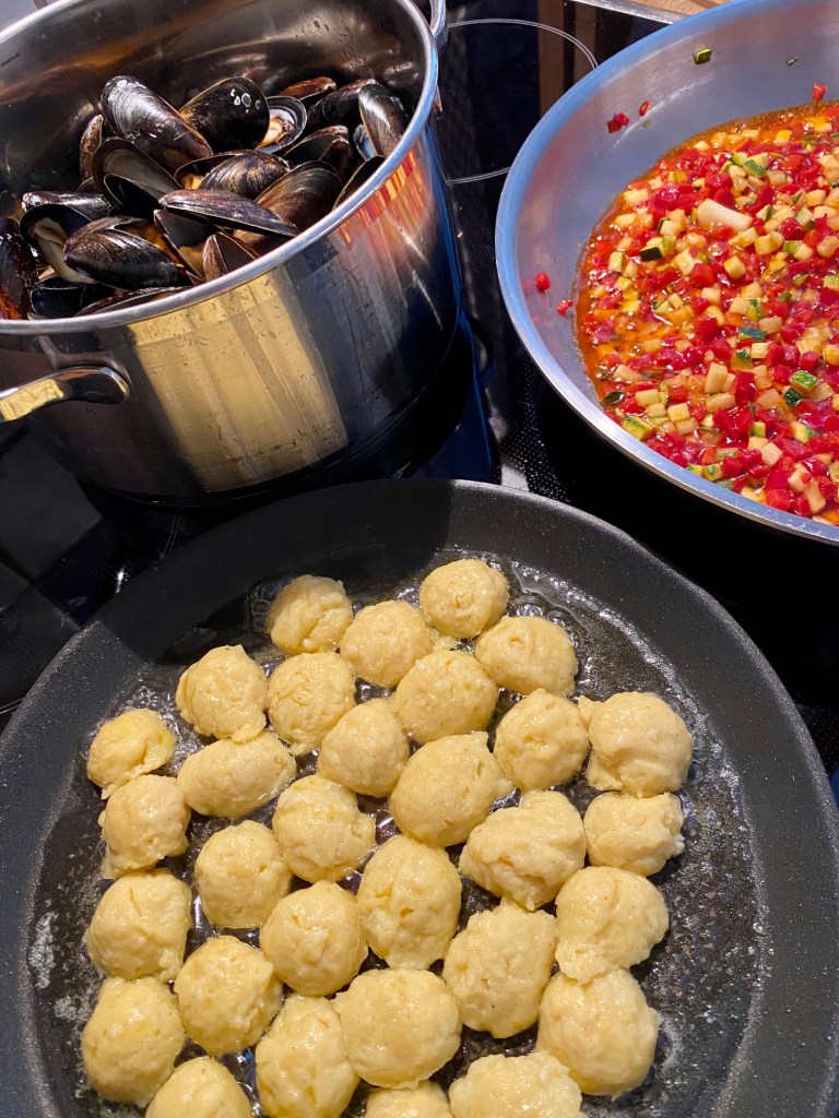 Press de kokte potetene gjennom en sikt.. ( ikke bruk stavmikser) avkjøl potetene før resten av ingrediensene tilsettes. Bland dette forsiktig til sammenhengende masse. Ha mel på benken, del deigen i to, og rull ut i to pølser, kutt i biter på ca 1,5 cm… eller bruk en melon kuleskje og lag små kuler som vist på bilde.. Sett en stor kjele med vann på kok, ha i 10 gram salt pr liter vann.. når vannet koker, putt i gnocchi la de koke til de flyter opp, ca 1 minutt, la de koke i nok et minutt.. øs opp, og legg disse i kaldt vann.. når de er avkjølt, tøm i et dørslag.. la vannet renne av, sett i kjøleskap til disse skal stekes i litt smør eller olje.. Godt tips, ha litt olje over gnocchiene før de stekes.