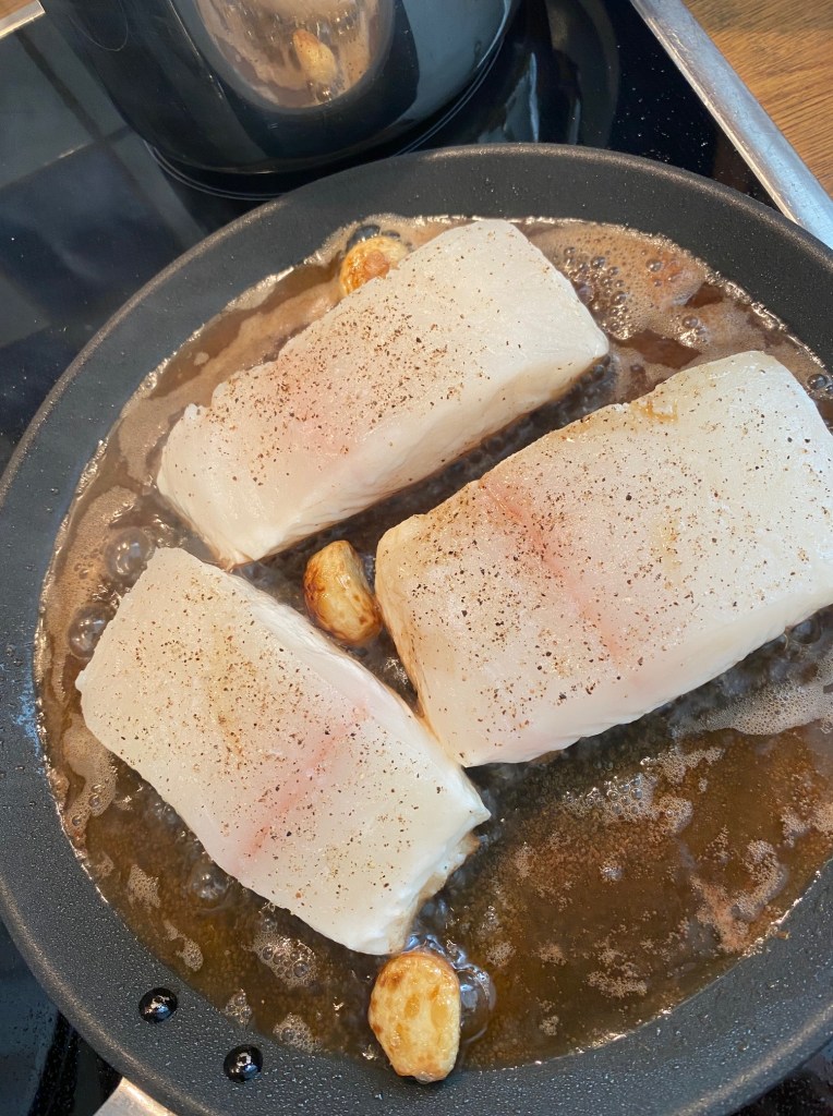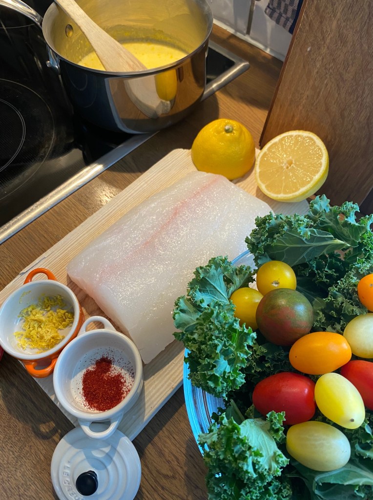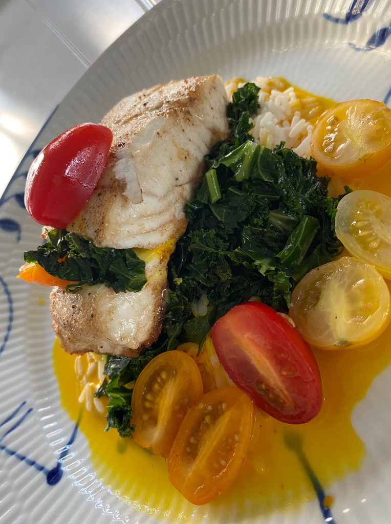 Her en enkel og smakfull fiskerett, med tilbehør som passer til både rød eller hvit fisk, servert med grønnkål, flerfarget cherrytomater pluss en god safransaus.. Sausen kan gjøres ferdig på forhånd, bare å gi et oppkok og smakstilsette safran pluss salt og pepper. Grønnkålen snittes i god tid, og tomatene deles.. Her servert med ris, som passet utmerket til denne retten.