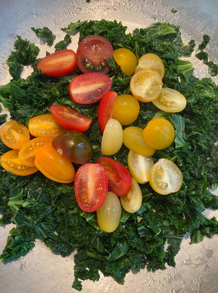 Fjern den grove stilken på grønnkålen, og kutt den i passe strimler, ta frem en stekepanne med høye kanter, fyll opp vann. ca 1 cm fra bunnen, kok opp. Tilsett 1 sps smør og litt salt og grønnkålen, la dette koke på middels varme i ca 2 minutt, til grønnkålen faller sammen.. hell av restvannet, tilsett 1 sps smør, sitronskallet pluss litt pepper, fordel tomatene på toppen slik som bildet viser.