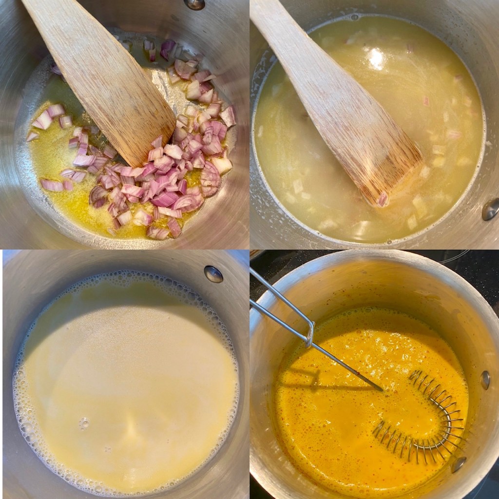 Start med å finhakke løk, og blank den lett i en kjele.Ha i hvitvin og kok opp, så tilsettes fiskekraften, kok opp,og reduser til halvpaten.. ta kjelen av platen, tilsett fløten, og sil sausen.. nå kan denne stå til du skal lage resten av måltidet.. Før servering koker du den forsiktig opp, tilsetter safran, pluss salt og pepper.. hvis ønskelig trekk kjelen av platen og visp inn en klatt med smør.