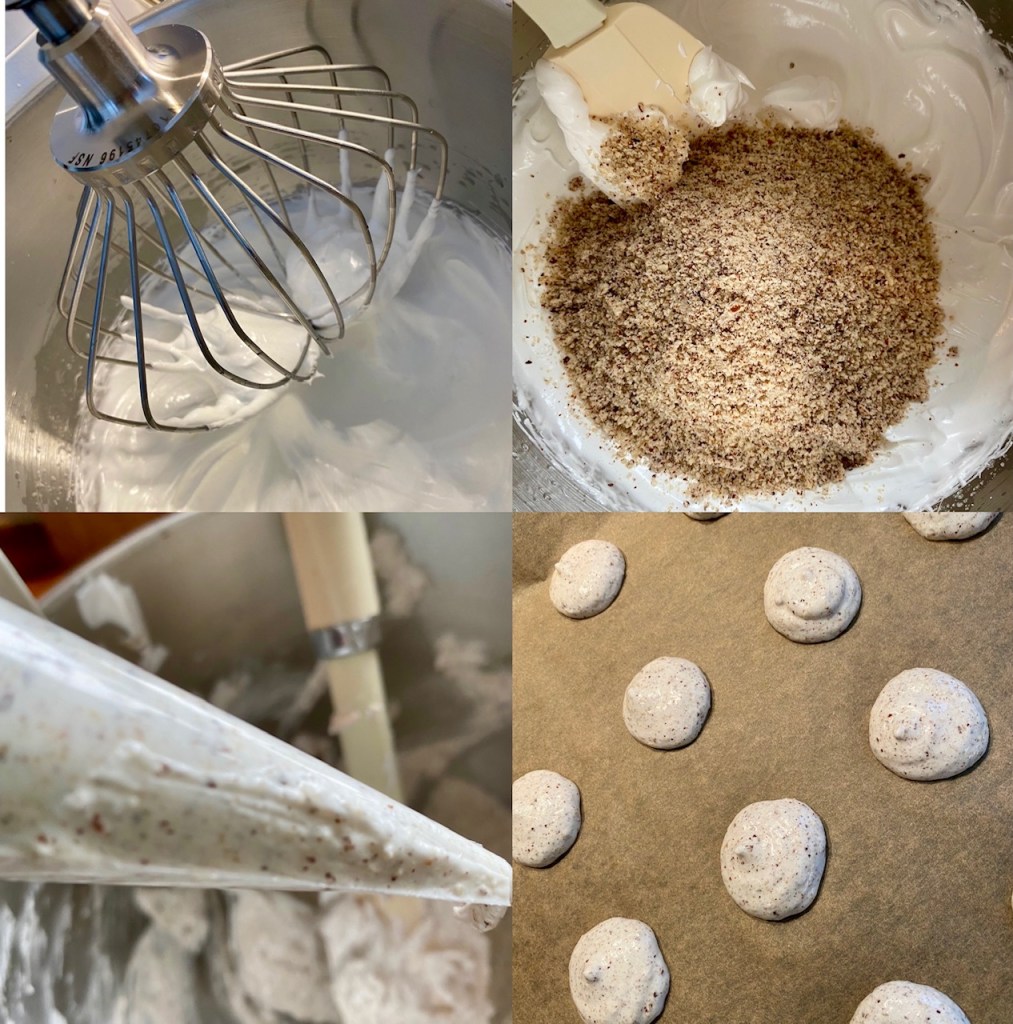 Start med å kjøre hasselnøttene i en kjøkkenmaskin, pisk eggehvitene stive, tilsett sukker, tilslutt salt og vend inn hasselnøttene.. sprøyt disse ut på brett, stekes på 170 grader i ca 15 minutt.. la kakene kjølne på stekebrettet noen minutter før du legger de over på en rist.