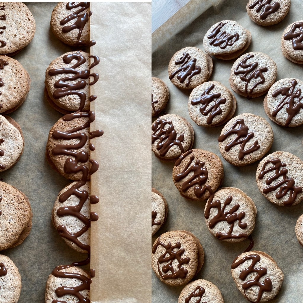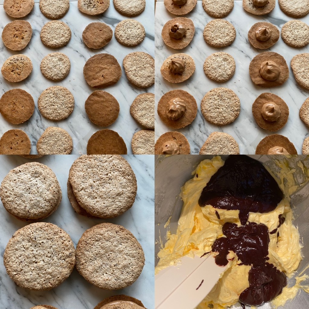 Mens kakene blir kalde lages smørkremen.. rør smør og melis hvitt, tilsett en og en eggeplomme om gangen, visp til en luftig krem… vend inn smeltet sjokolade, og smak til med litt maldon salt.. ( salt kan sløyfes)