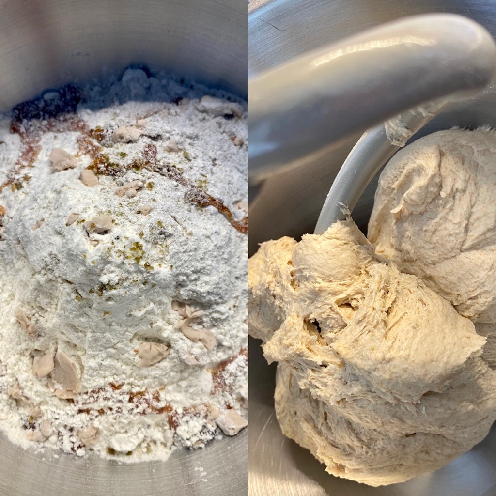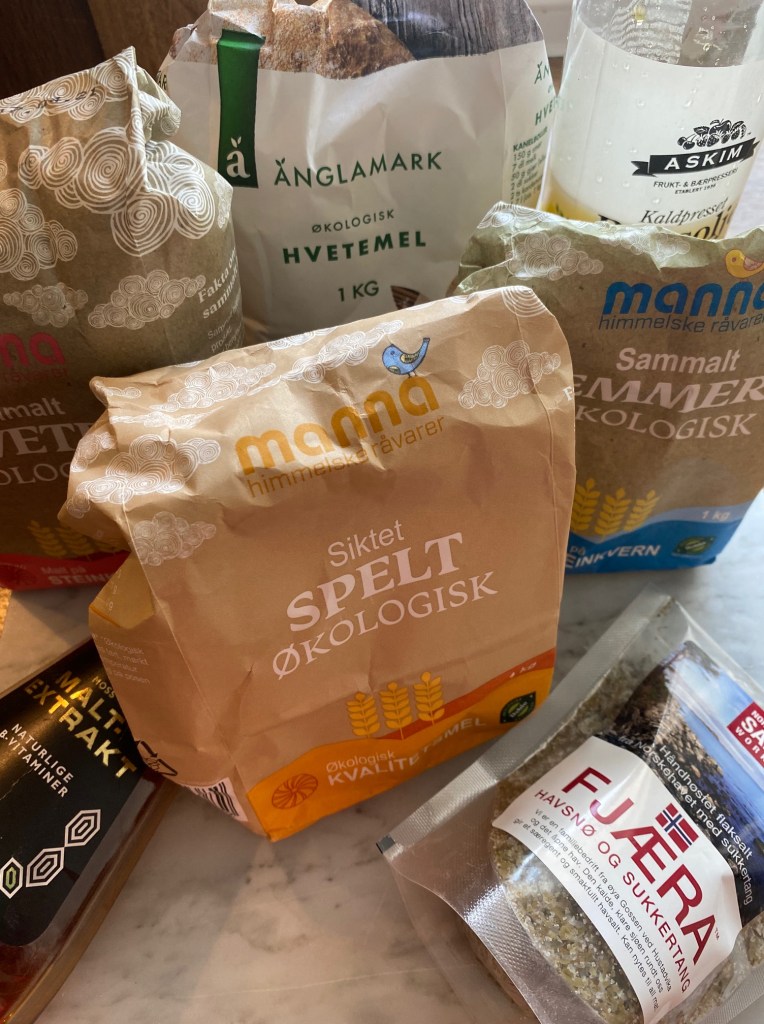 Dette brødet blei til pga flere poser med melrester.. Her valgte jeg å ha alle ingredienser i kjøkkenmaskinen, elte i 10 minutt… brukte lite gjær, lot deigen heve i 5 timer, men ingen problem å øke gjærmengden, og heve i ca 1 time.. Resultat, et saftig brød med mye smak og sprø skorpe. Bare å bruke fantasien.