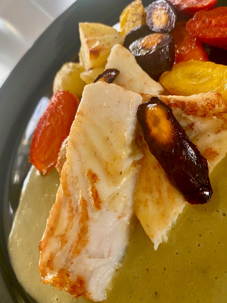 Det er ingen hemmelighet at jeg er inspirert av de STORE kokker vi har i Norge, her er oppskrift og tips fra Eyvind Hellstrøms siste kokebok, ved navn Hellstrøms hemmeligheter.. Her kan en bruke hvilke som helst hvit fisk, jeg fikk tak i piggvar, som sammen med bakte rotgrønnsaker og poteter, pluss den fantastiske karrisaus, gjorde retten til en smakfull og enkel rett.. med kort arbeidstid.