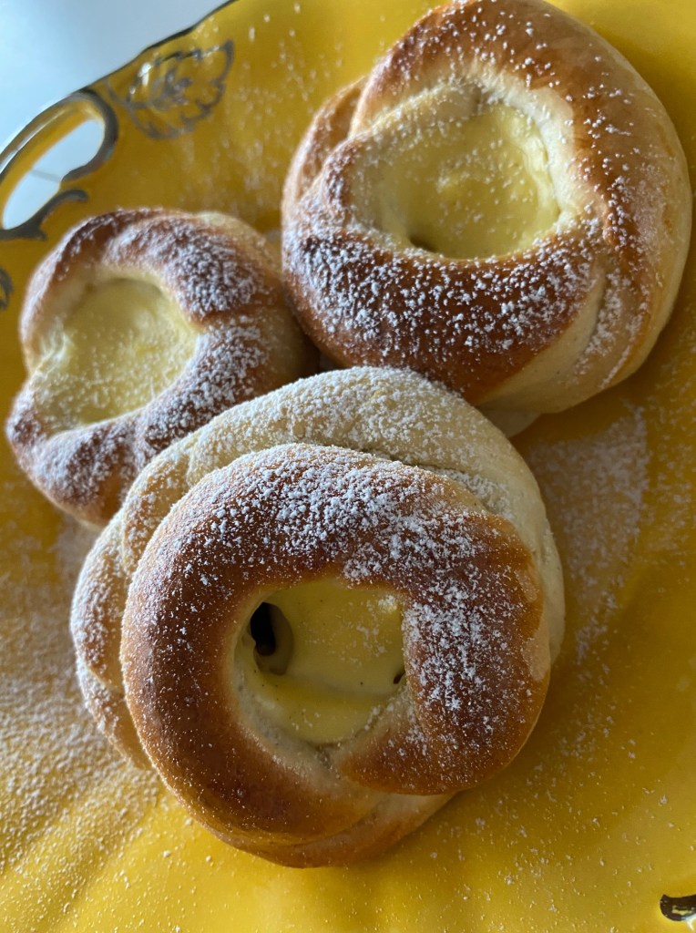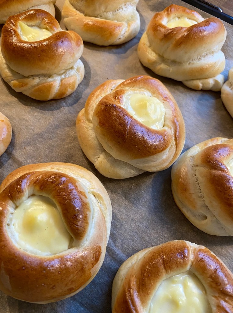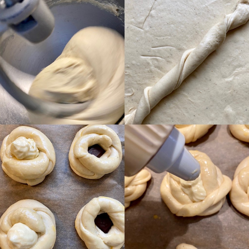Dette er en av mine enkle oppskrifter på bolledeig, har brukt den både til prinsessekake og fletteboller… den har kort arbeidstid, 1 heving.. Denne gang kjevlet jeg ut et rektangel, delte opp i passe remser, tvinnet til knuter.. og brukte et godt fyll.
