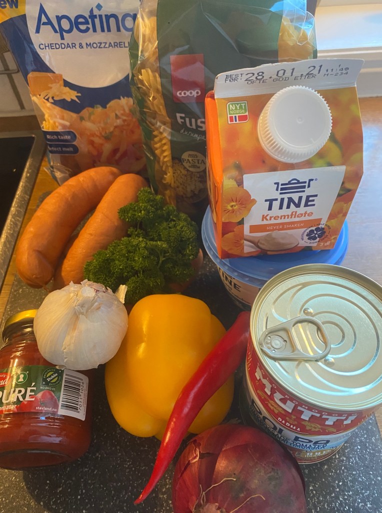 Begynn med å koke pasta. Hakk pølser, løk,hvitløk, chili og paprika i passe terninger slik at alt er klart.