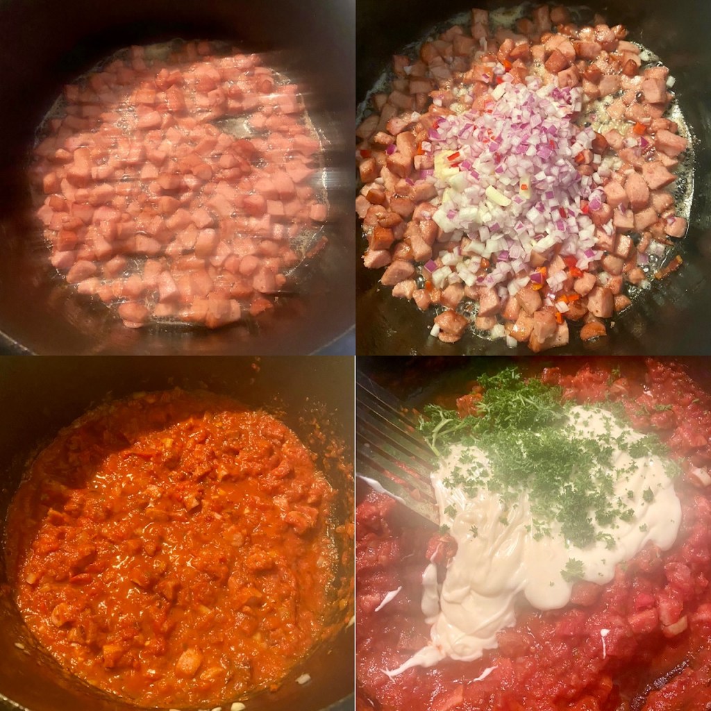 Lag så den hvite sausen, og vend inn i tomat/pølseblandingen slik bildet viser