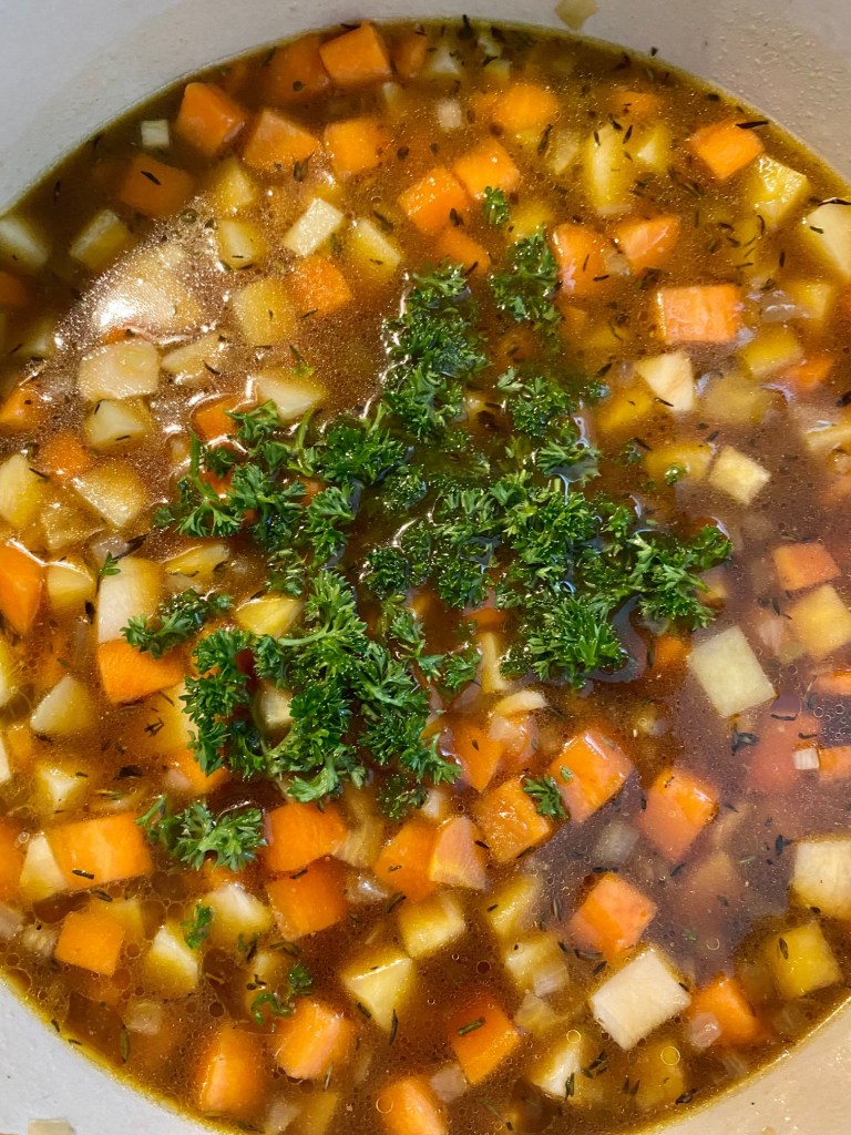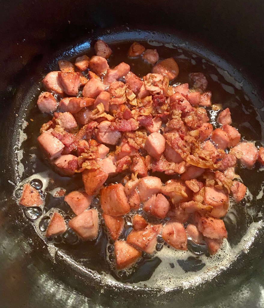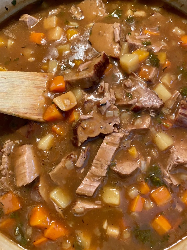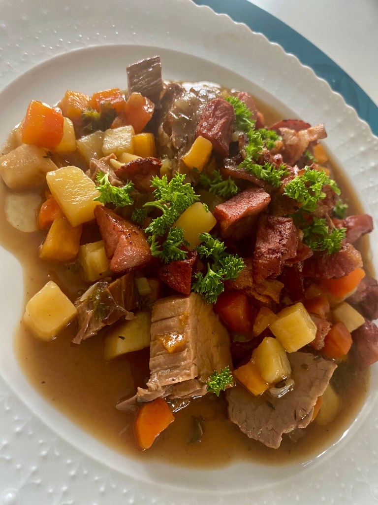 En enkel middag etter en stor norsk sporsthelg… slik ble denne retten til.. Er glad i vinteridrett, og da passer det bra med en enkel og smakfull gryte.. Vi blir stadig minnet på viktigheten av å sjekke kjøleskapet, se hva du har, og her er mitt resultat.. En god kjøttkraft/kjøtt etter en oksestek, litt bacon/pølserester, bruk det du har.