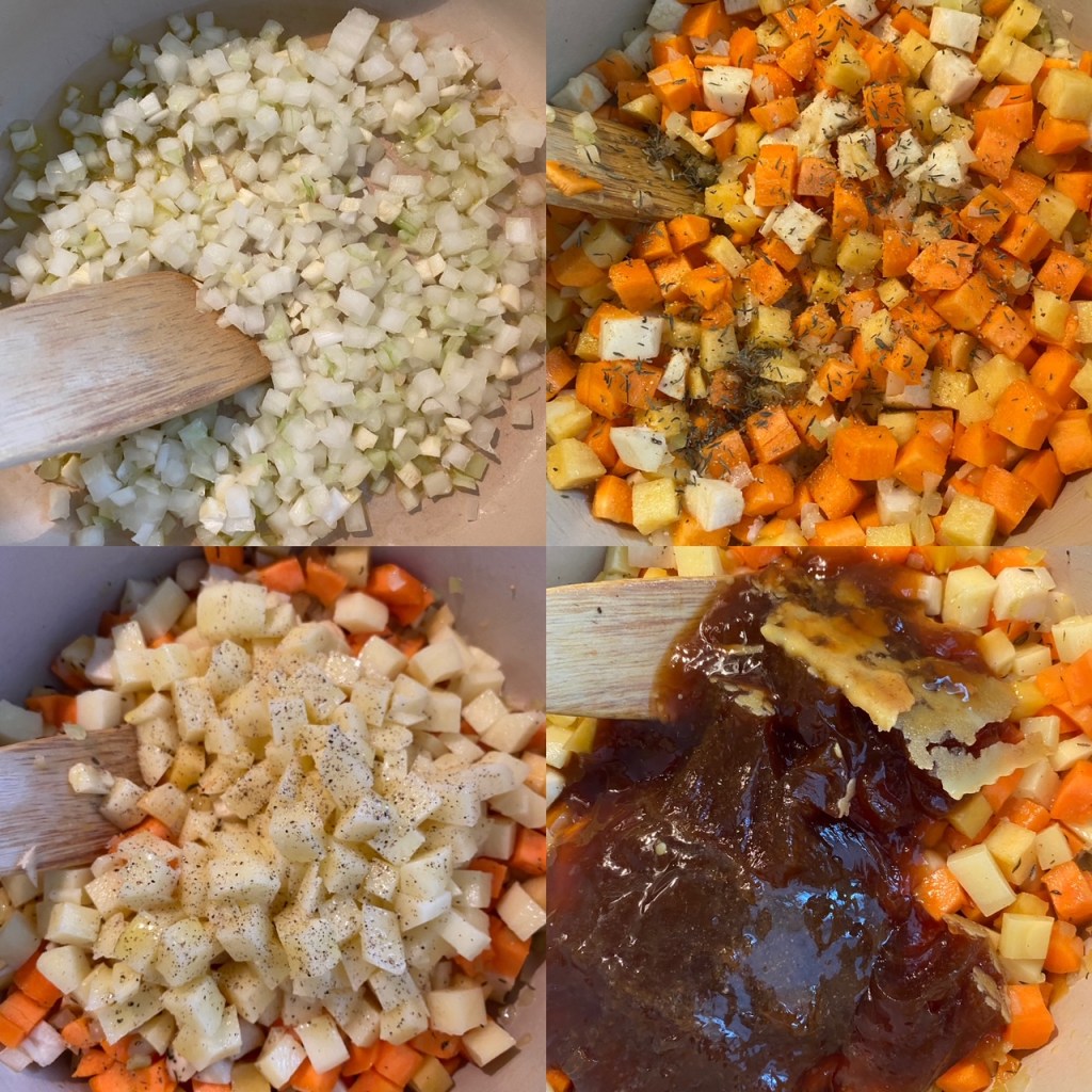 Hakk alle grønnsaker og pølse/kjøttrester, så enkelt med gode forberedelser, kan gjøres i god tid.Begynn med å surre løk/hvitløk i olivenolje på middels varme. Tilsett alle grønnsaker untatt potetene, hell på krydder pluss litt mer olivenolje, surr i 3 minutter før de hakkede poteter tilsettes.. la dette småsurre i 5 minutter, ha i kjøttkraft og kok opp. Ved å surre grønnsakene i olivenolje, unngår en at grønnakene koker i stykker.. Kok opp, og tilsett persille. La dette småkoke uten lokk i ca 35 minutt.. Tilslutt tilsettes jevning, småkok i 3 minutter for å fjerne melsmaken, trekk gryten av platen, vend forsiktig inn som her okstestek rester. Jeg hadde pølse og bakonrester, dette hakket jeg opp og sprøstekte, som ble til en god topping.Grønnsakene hele og møre, smakfull saus, pluss sprø topping.. bare å nyte.