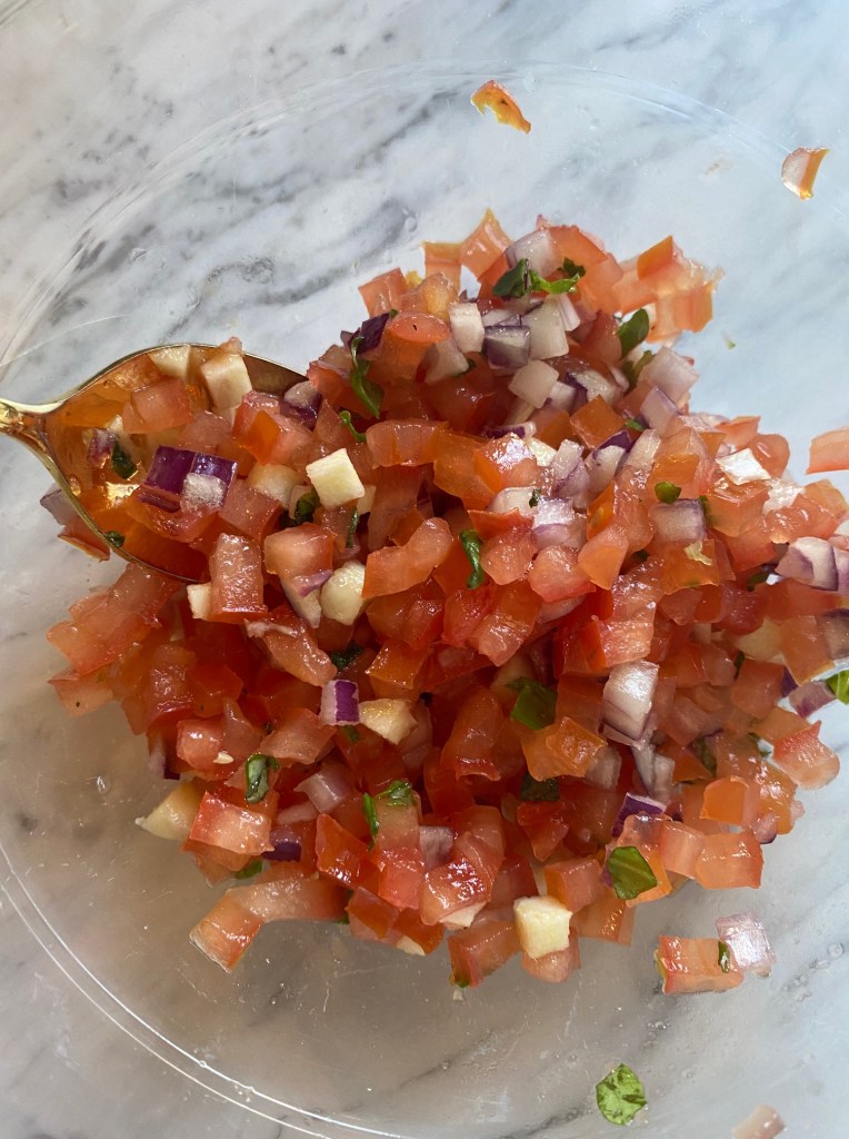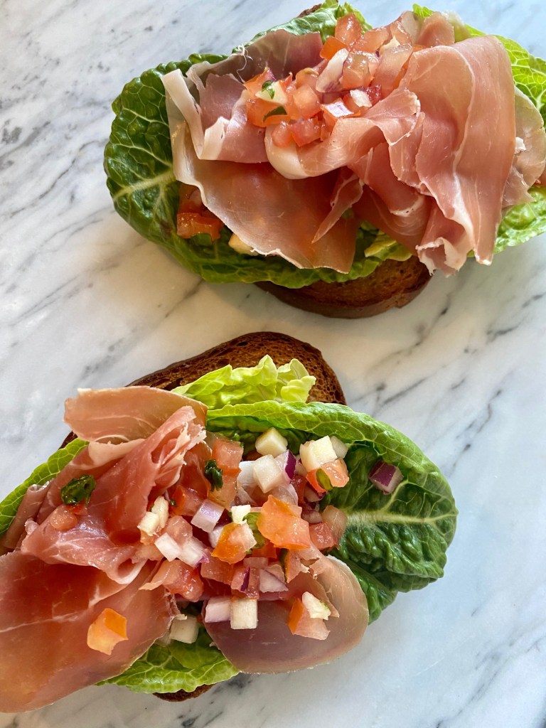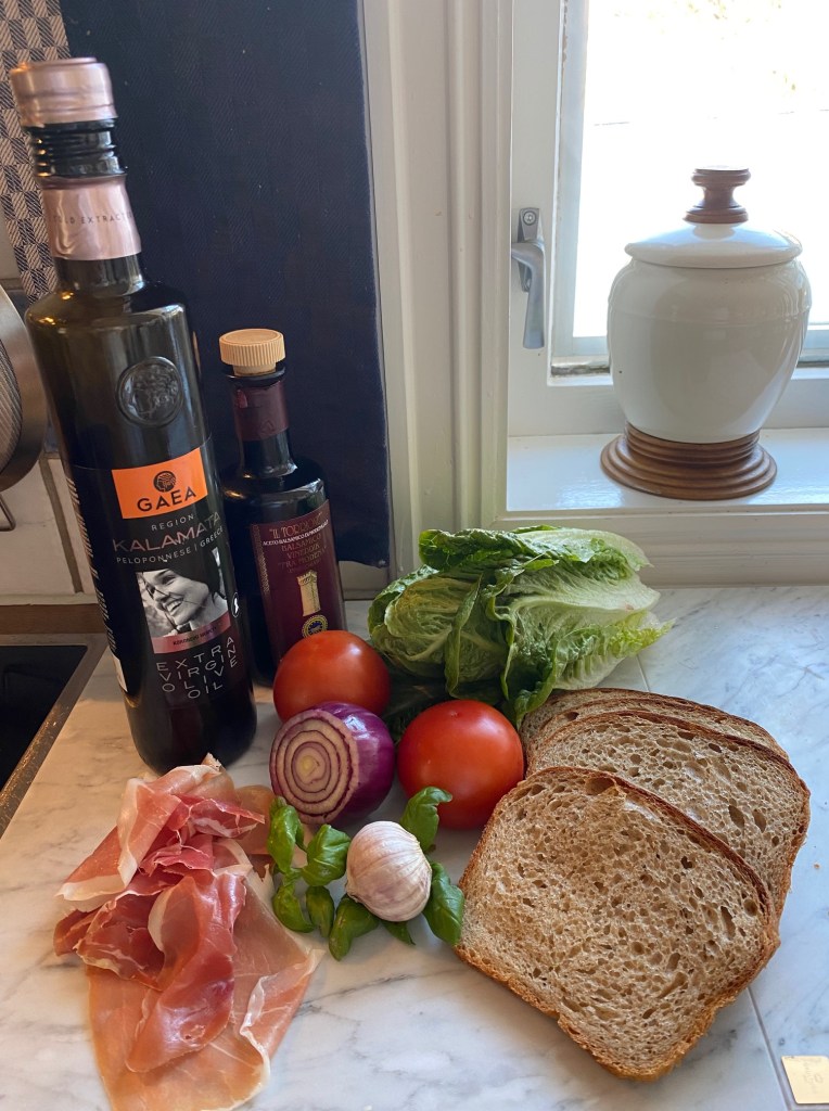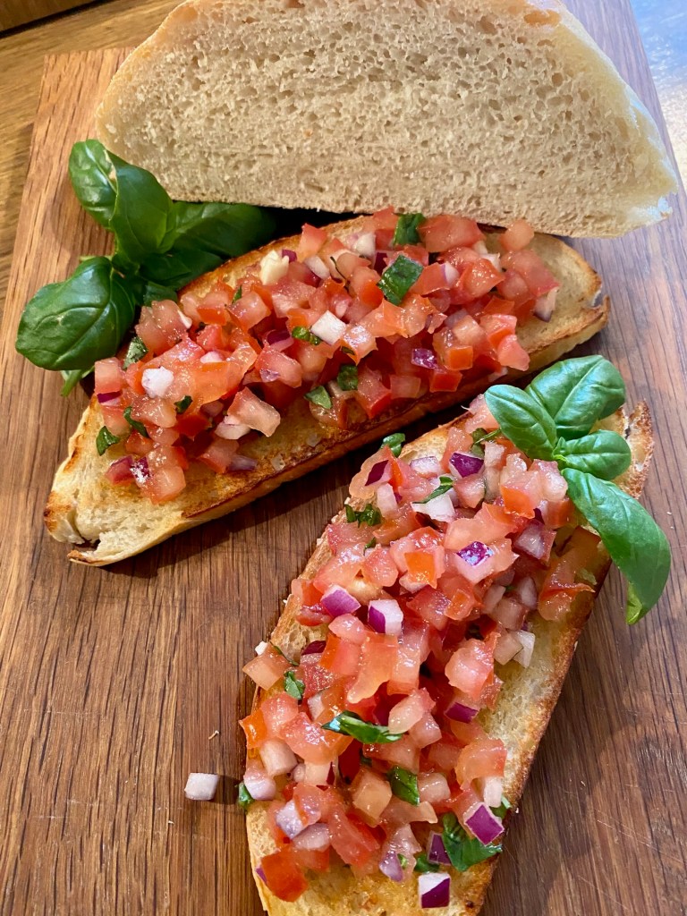 En smak av Italia.. Den består av grillede eller stekte rester av gammelt brød, påsmurt olivenolje og litt saltdryss, pluss et tomat/løkfyll etter smak. Opprinnelig var dette en tradisjonell italiensk fattigmannskost. Her har jeg brukt 3 forskjellige brødsorter, et godt fyll pluss litt serranoskinke, eller parmaskinke… en god forrett, eller en liten lunsj.. Her er mine favoritter..