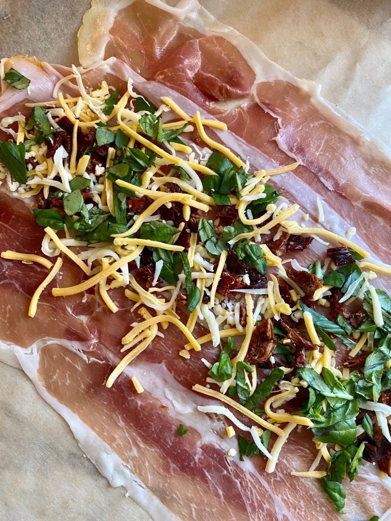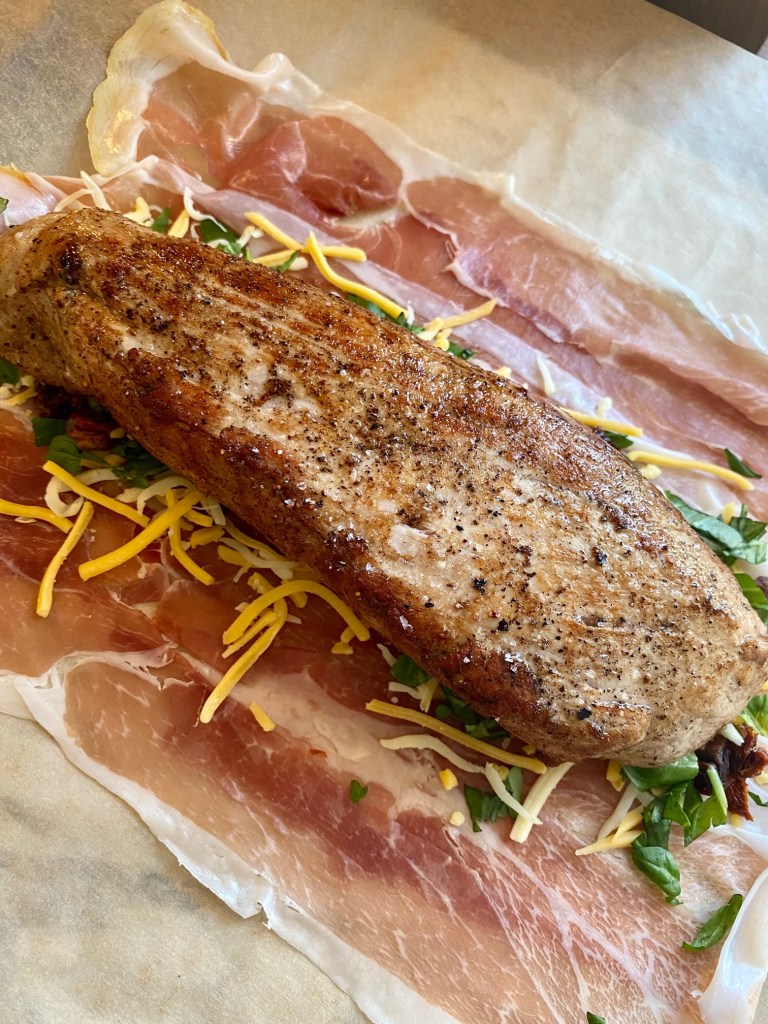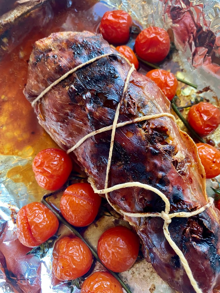 Gjør slik bildene viser. Når filet er stekt og surret, legg den over i en liten langpanne, bland olje og balsamico, tøm over filet, legg cherrytomater på begge sider av filet, putt inn i forvarmet ovn på 180 grader i ca 20-25 minutt… jeg velger den gjennomstekt… men la den hvile i 10 minutt før du skjærer opp.