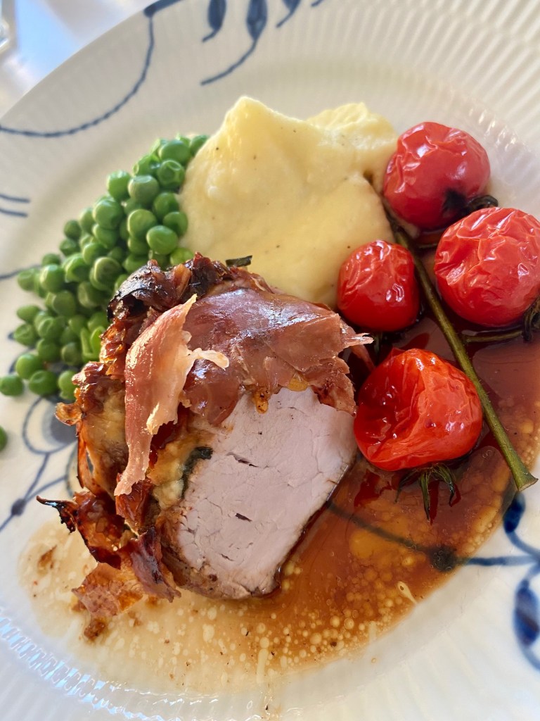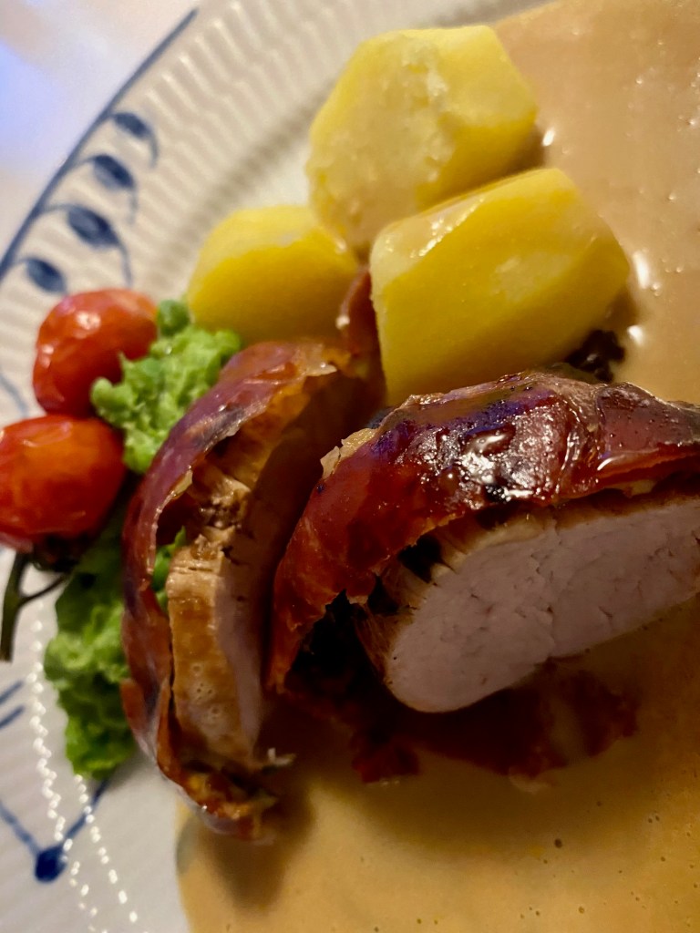 Dette er en enkel måte å tilberede indrefilet av svin.. kort arbeidstid, smakfullt, tilbehør velger en etter smak, jeg valgte en mos av mandelpoteter og sellerirot, pluss grønne erter.. de bakte tomatene smakte godt sammen med dette… selvfølgelig kan du velge spekeskinke etter egen smak.