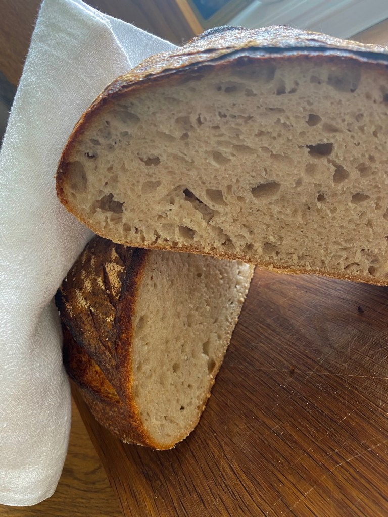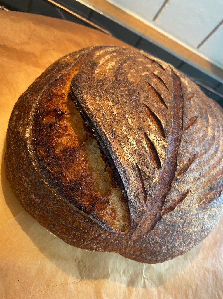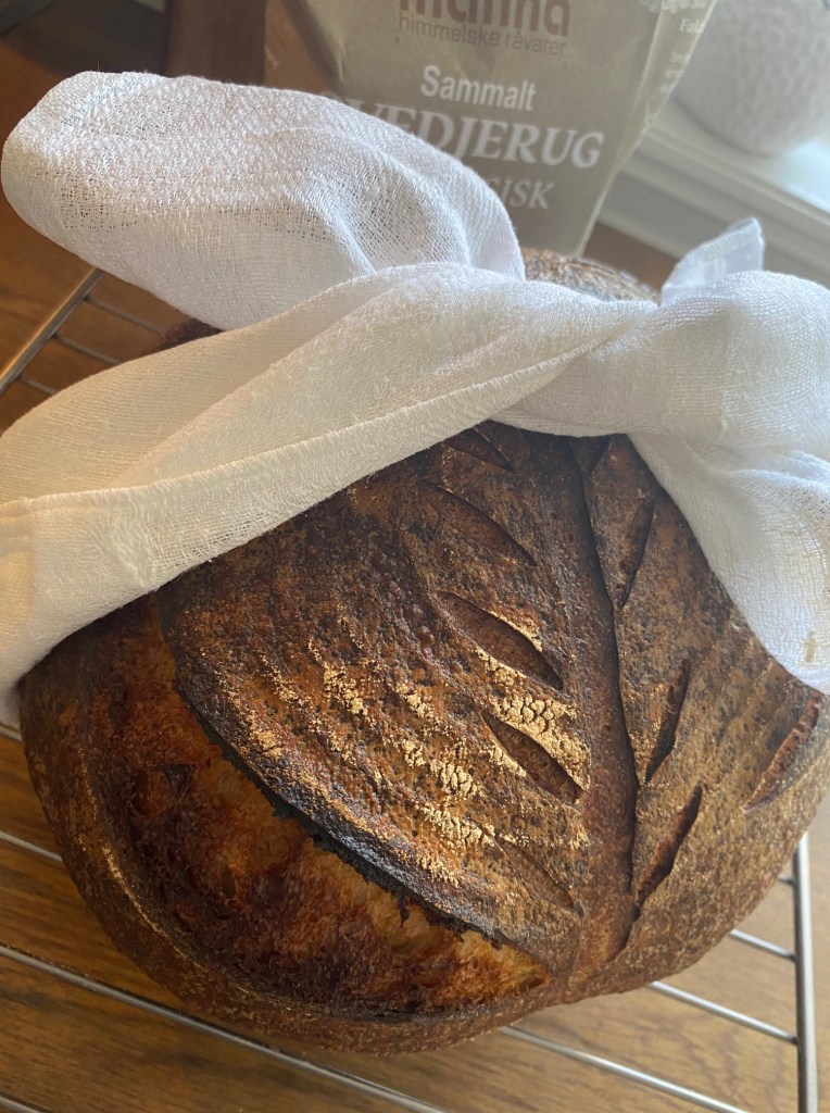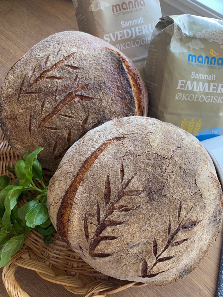 Som nevnt i tidligere oppskrift, så finnes det en drøss med oppskrifter på surdeigsbrød.. Jeg har prøvd flere metoder…Baking med surdeig er en metode som tar lenger tid enn med vanlig gjær, denne oppskrift er med elting i kjøkkenmaskin, 4 brettinger av deigen, etterhev på benk, natten over i kjøleskap….Denne deigen var mindre klisset enn andre jeg har prøvd,en liten forskjell til, jeg matet surdeigsstarter med økologisk sammalt rugmel 12 timer før baking.. resultatet ble utmerket.