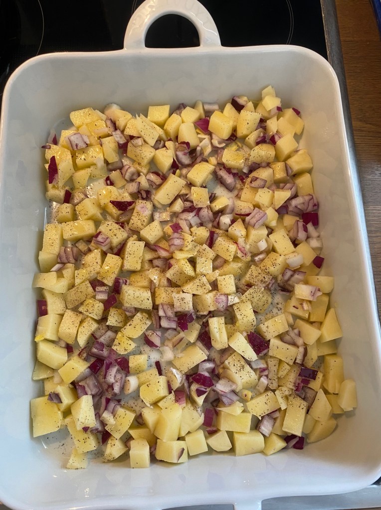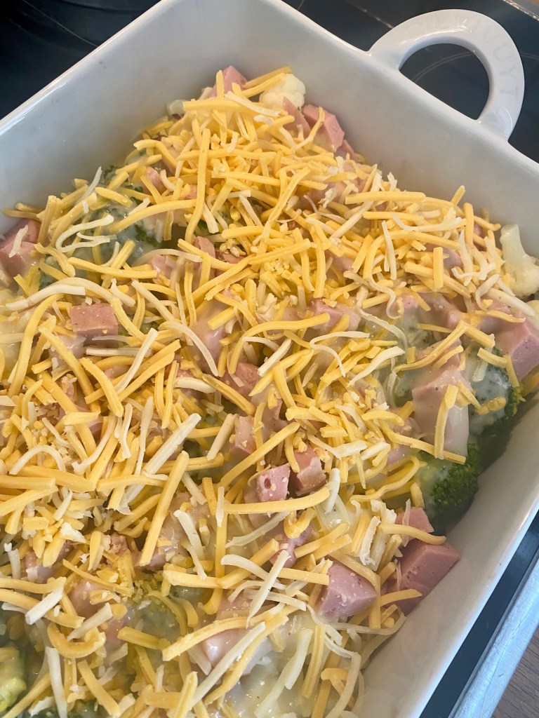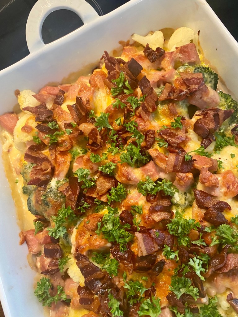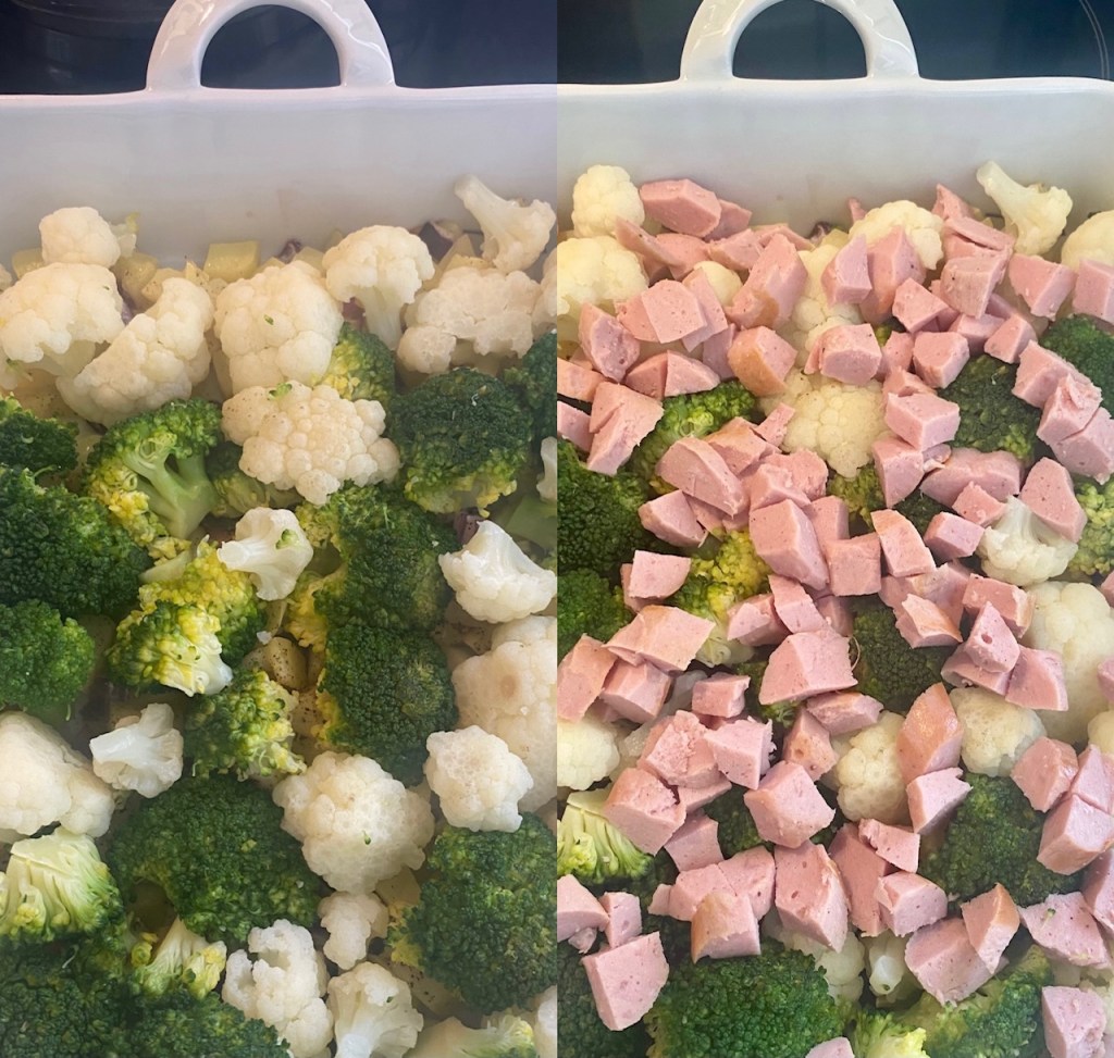 Etter en flott langhelg er det bare å ta en titt i kjøleskapet og se hva du har tilovers, litt blomkål og brokkoli, noen kjøttpølser, en løk, poteter pluss ost og bacon.. alt i en ildfast form, putt i stekeovn i to etapper… himmelsk godt.