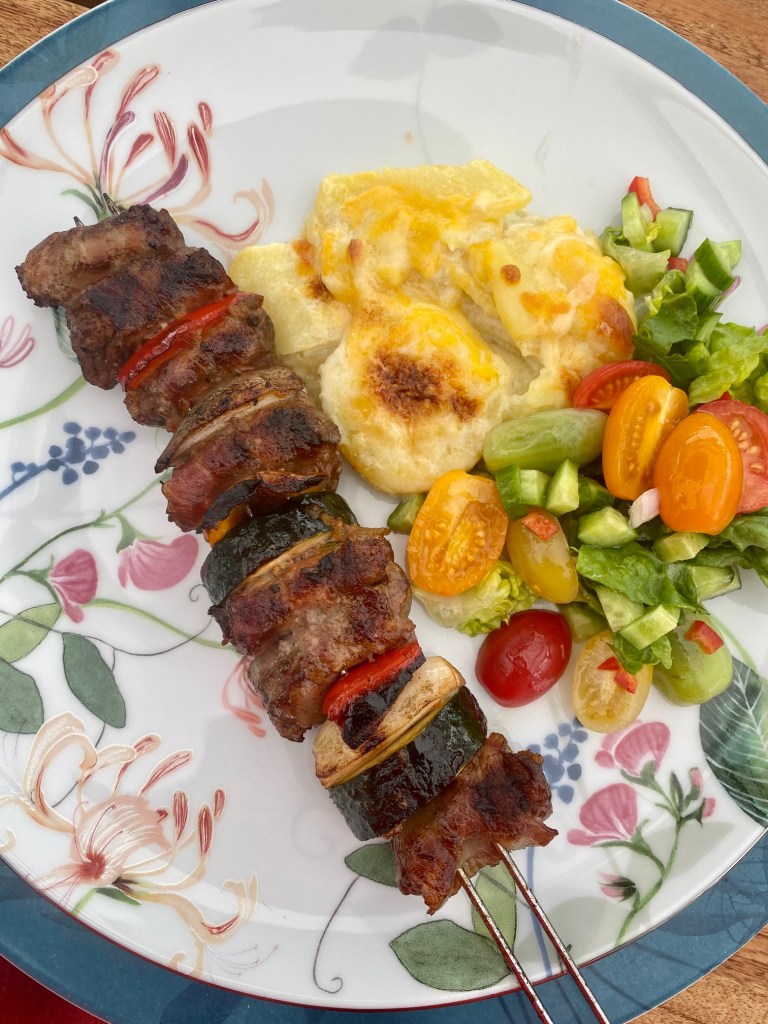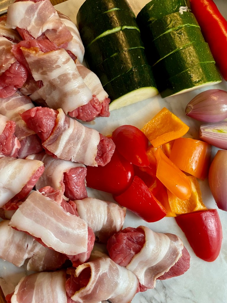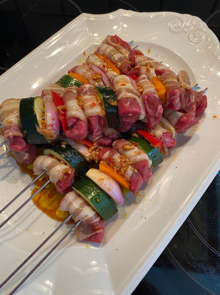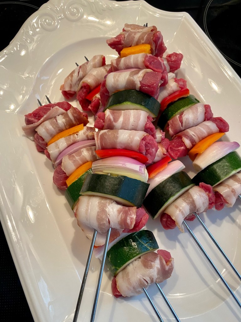 Grillsesongen er godt i gang, i Norge er den ikke så lang, så en må benytte de få dager vi har. Her er grillspydene tredd med vekselvis kjøtt og grønnsaker, men kjøttbitene blir lett tørre, derfor surrer jeg bacon rundt dem, pluss en god marinade som topper det hele.. Her er mitt forslag..