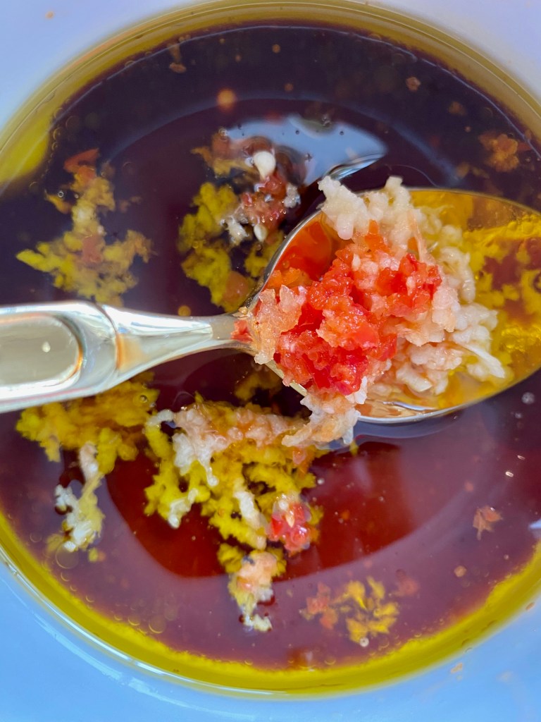 Begynn med klargjøring av spydene, når de er tredd, lag marinaden. Bland rapsolje og limesaft, tilsett soyasaus, press hvitløk og chili gjennom en hvitløkspresse, det gir best resultat, pensle så marinaden over spydene, og kvern disse med sort pepper.. enentuelt salt.. men husk bacon salter kjøttet… Dette kan gjøres i god tid, la spydene ligge tildekket med marinaden i ca 1 time før grilling…