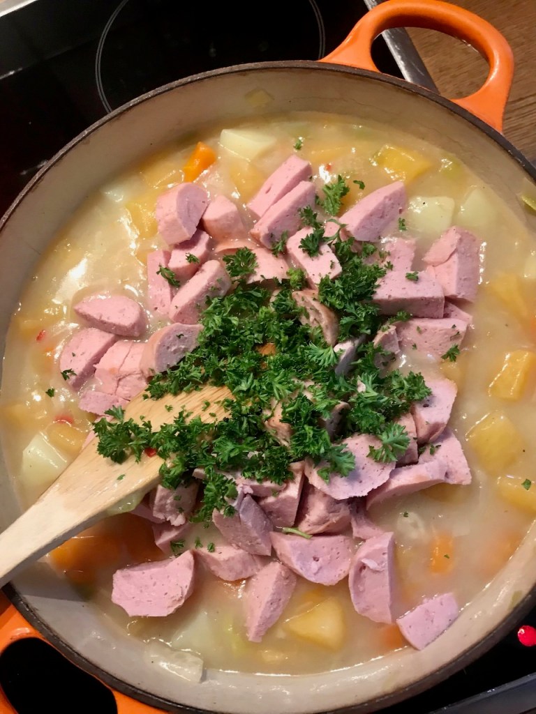 Etter flere henvendelser, pluss ønsker fra følgere på blogg og instagram velger jeg å legge ut min oppskrift på Pølselapskaus…. Denne er slik jeg vokste opp med etter god gammel oppskrift, grønnsakene varierer jo etter årstid, men her er en oppskrift basert på varer en får hele året.. Det som setter ekstra god smak er en god kraft… her har jeg brukt kyllingkraft, men lammekraft er også utmerket.