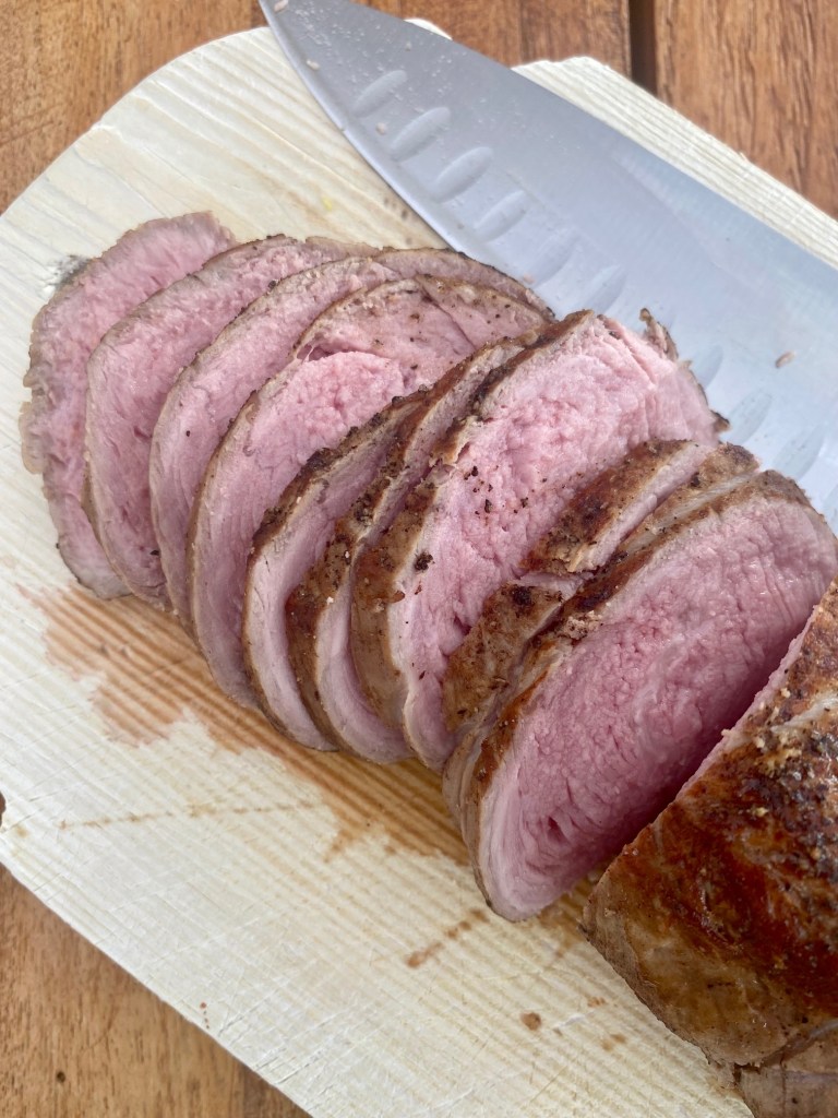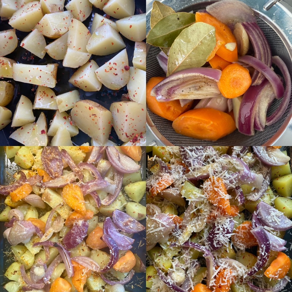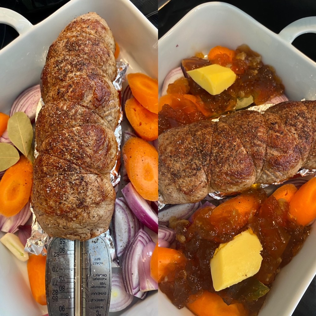 Begynn med å sette på stekeovn på 100 grader, hakk grønnsakene, surr filet og brun raskt i en jerngryte.Finn en passe ildfast form, legg folie i midten, (som filet skal ligge på) fordel grønnsakene på hver side, legg filet oppå folie, krydre med salt og pepper, sett inn steketermometer, pluss tilsett kjøttkraft, gjerne et par klatter med meierismør.Når steketermometer viser 56 grader, (dette tar ca 80 minutt) ta ut formen og la kjøttet hvile i ca 25 minutt. Skru opp ovnen til 210 grader, for mens kjøttet hviler tilberedes tilbehør.Her hadde jeg forhåndskokt potetene i 10 minutt. Del opp disse i passe biter, krydre etter smak, putt i ovn på 220 grader i ca 15 minutt, ta så ut, tilsett grønnsakene som ble stekt sammen med kjøttet, strø over litt revet parmesan, sett tilbake i stekeovn i ca 10 minutt. Stekekraften jevnet jeg med maizena, pluss en fløteskvett , som ble en smakfull saus.Etter hviletid ser kjøttet slik ut, lys rosa… ønsker en mer stekt la steketermometer vise 60/62 grader. well done 70 grader.Kjøttet var saftig og mørt, grønnsakene passet utmerket til. Saus en liten høyder.