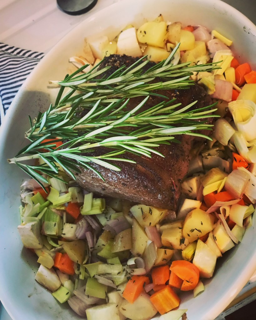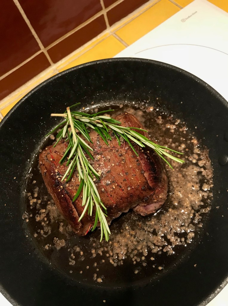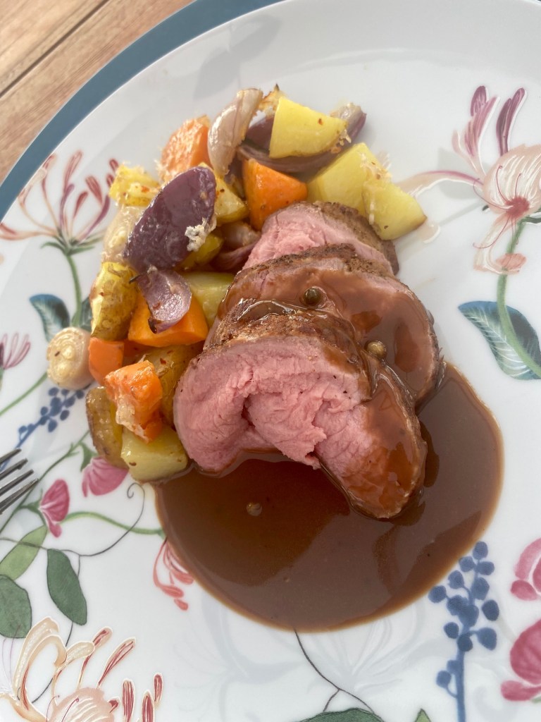 I provence selges den beste indrefilet med surret spekk på utsiden, dette gjør kjøttet veldig saftig, brun raskt i jernpanne/gryte, sett ovnen på 210 grader…på forhånd hakkes poteter, løk, hvitløk, gulrøtter, nepe purre og selleri… alt etter smak.Fordel alle grønnsakene i en ildfast form, legg kjøttet oppå, pluss en kvast rosmarin, hell over en blanding av 3 dl olivenolje pluss 1 dl soyasaus, salt og pepper en selvfølge, i tillegg bruker jeg tørket provence krydder over grønnsakene.. dette tar ca 30 minutt alt etter tykkelse på kjøttet. la kjøttet hvile litt før du skjærer opp og legger det tilbake i formen.. bare å sette formen på bordet og servere en god grønn salat til… enkel middag.