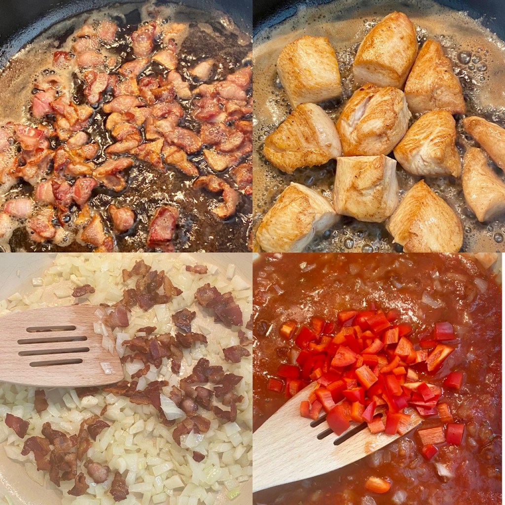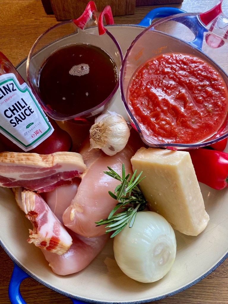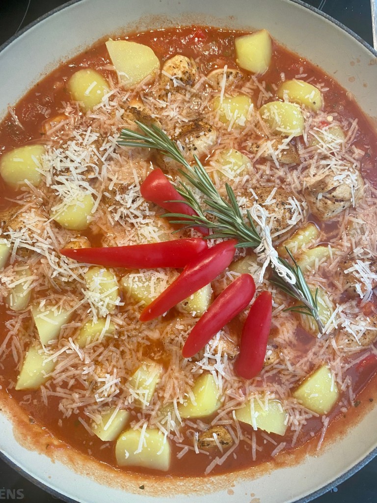 Dette er ekte italiensk husmannskost, jeg har spist den for lenge siden på en av våre turer til Italia. I dag minnet den kjente folkekjære Gladkokken meg på denne retten da han la ut sin versjon.. Retten serveres oftest med kyllinglår, jeg valgte å bruke filet.. noen serverer tilbehør ved siden av, jeg har fått retten servert med potetbiter i samme panne.. Tomatkraften setter en god smak på potetene, i tillegg til at det er enkelt å ha alt i en panne.. Retten kan forberedes i god tid, bare å putte i stekeovn i 30 minutt før servering.