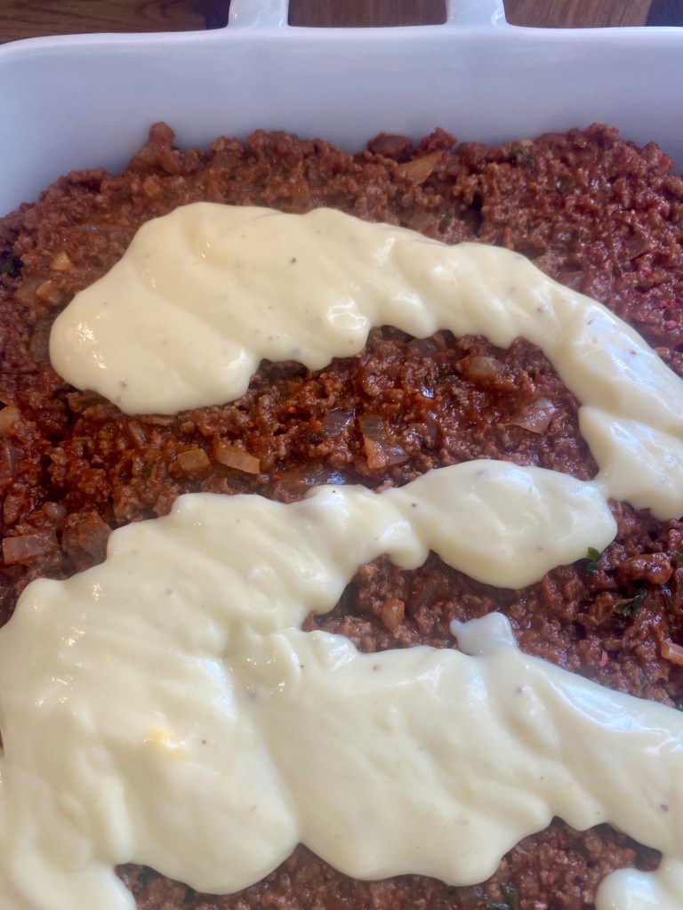 Et godt tips.. tilsett gjerne 4 sps av ostesausen i kjøttsausen før den fordeles over grønnsakene.