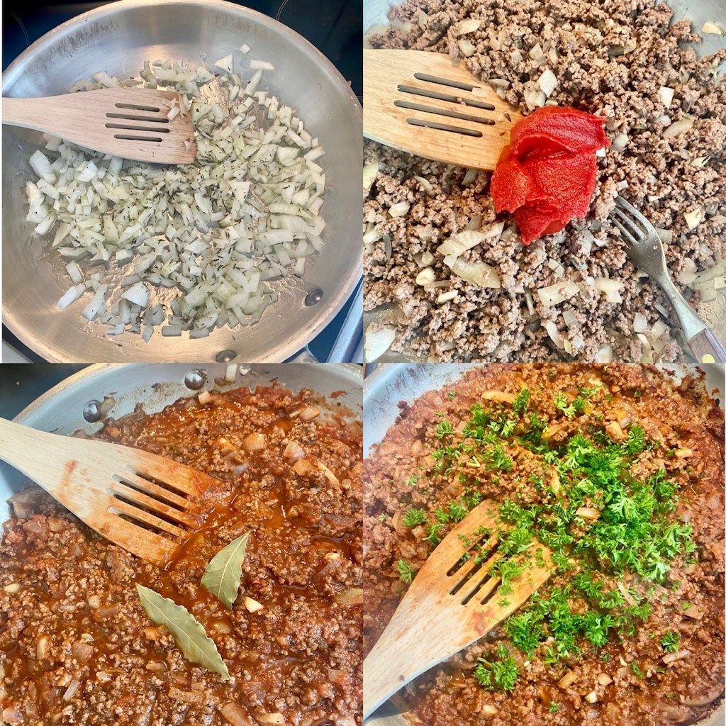 Begynn med å steke løk, hvitløk pluss sukker på medium varme, tilsett så karbonade/kjøttdeig, som stekes inn i løkblandingen, tilsett så resten av ingrediensene, gi et oppkok, dryss persille og putt inn lauvbærblad, la dette småputre i ca 30 minutt.