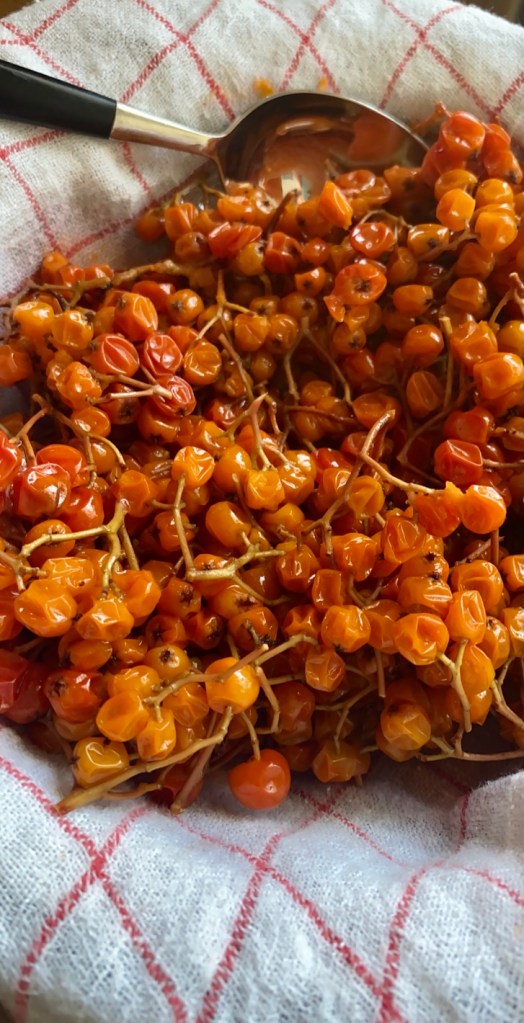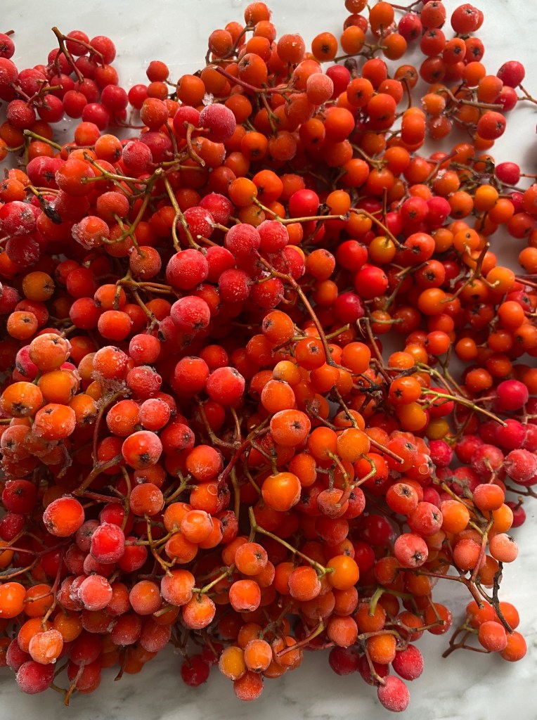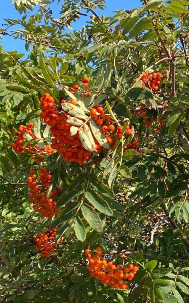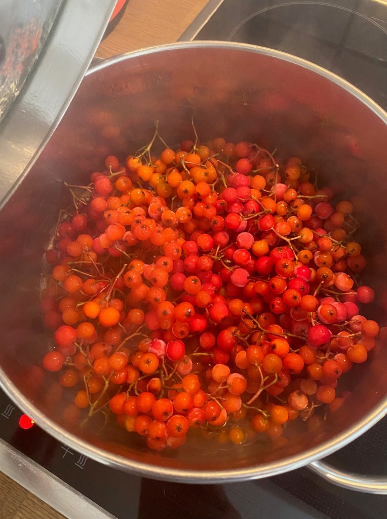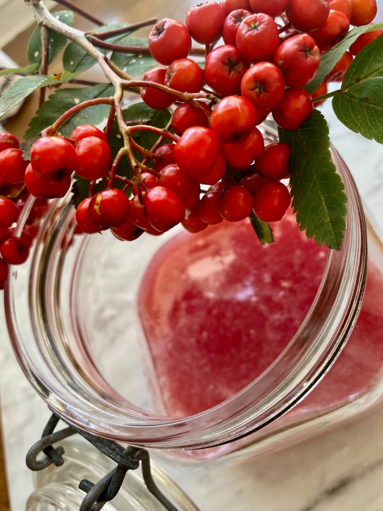 Sensommeren er den beste tiden å plukke rognebær. Nå bugner trærne av flotte bær. Rognebærgele passer utmerket til endel oster, alt viltkjøtt pluss andre kjøttretter. Kort arbeidstid, holder seg i flere måneder i tette glass…. plukk gjerne å ha i fryseren, ta opp etter behov.. Husk rognebær inneholder mye C vitamin.