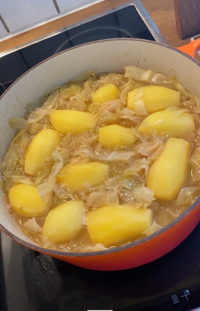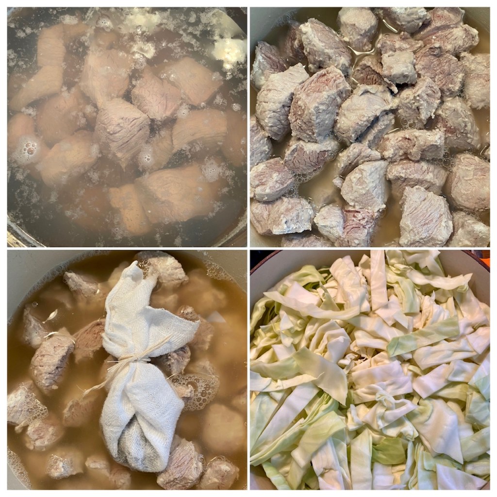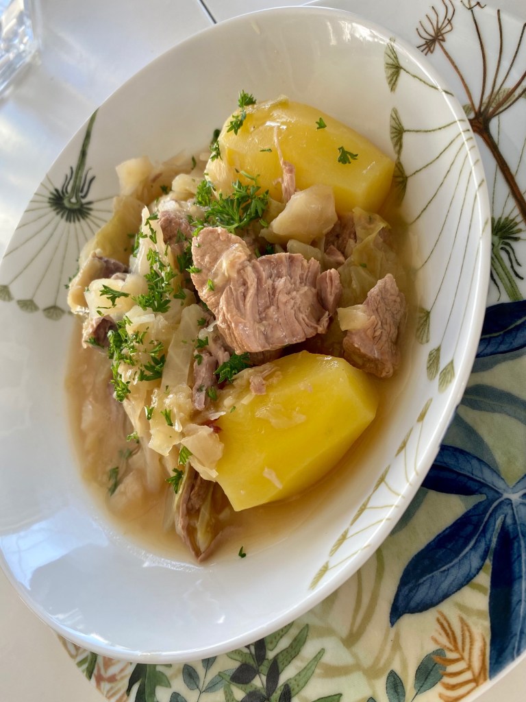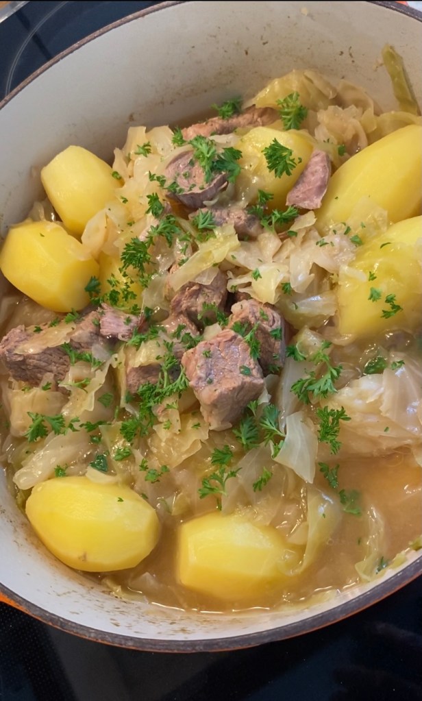 Jeg valgte lammelårskiver fra en lokal produsent, Klostergården, skjærte vekk bein og fett, kuttet i passe terninger.Jeg valgte å koke opp grønnsaker, denne grønnsaksbuljong slo jeg over kjøttet før kål ble dekket over kjøtt.. ta det du har av grønnsaker.Her de 4 trinn… Jeg velger å gi kjøttbitene et oppkok, for å få mest mulig klar kraft.. har kjøttet over i gryta, drysser 3 sps hvetemel over kjøttet, vender dette inn, tømmer over buljong, så det dekker kjøttet, rør litt i kasserollen slik at alt blandes godt, legg over krydderkvast, salt kjøttet. Legg så kål over, og dryss over salt… kok på middels varme med lokk i ca 90 minutt.Etter 90 minutt legger jeg i passe antall poteter, og lar disse koke med de siste 30 minutt. Potetene blir veldig smakfulle i den gode kraften.Klar til servering. Fjern krydderpose med pepper, dryss over persille, og nyt.Så enkelt å servere når kjøtt er ferdig renset.