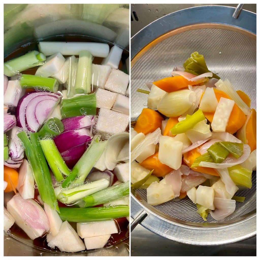 Kok dette i 1 time, sil og klem godt ut av grønnsakene.