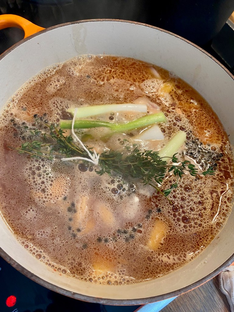 Her er avskjær brunet, tilsatt litt grønnsaker, står og småkoker i 3 timer, blir perfekt kraft og god saus til lammecarre eller lammelårsteken.
