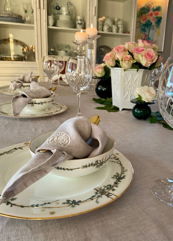 Her er en bordekking fra oktober 2021, grå lin duk og servietter, potteskjuler som brukes til juleroser i adventstid, får friske roser i pastell som en variant, supplert med noen små grønne bobler fra Magnor Glassverk og Finn Schjøll.. Bruk det du har, og resultat blir bra.