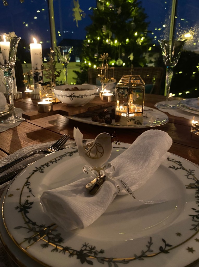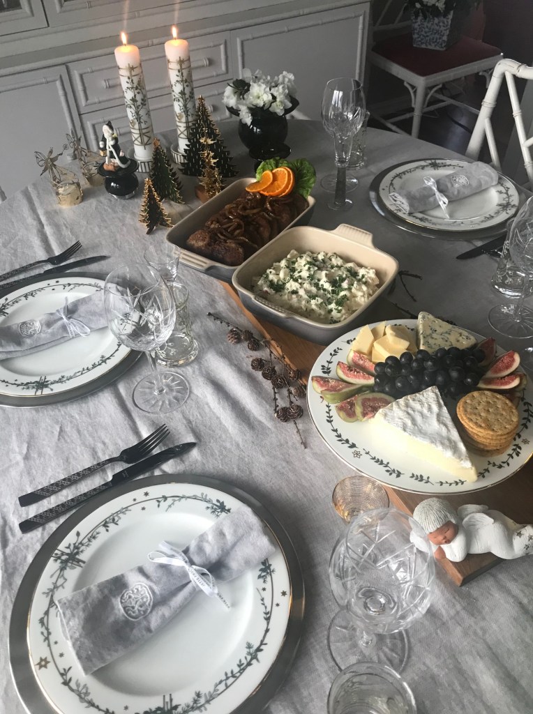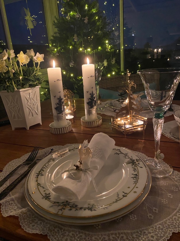 Samme servise, og samme duk og servietter, her fra en førjulsfrokost, litt engler, lerkekongler og julepynt som supplement. Stålbestikk pluss stål dekketallerken.