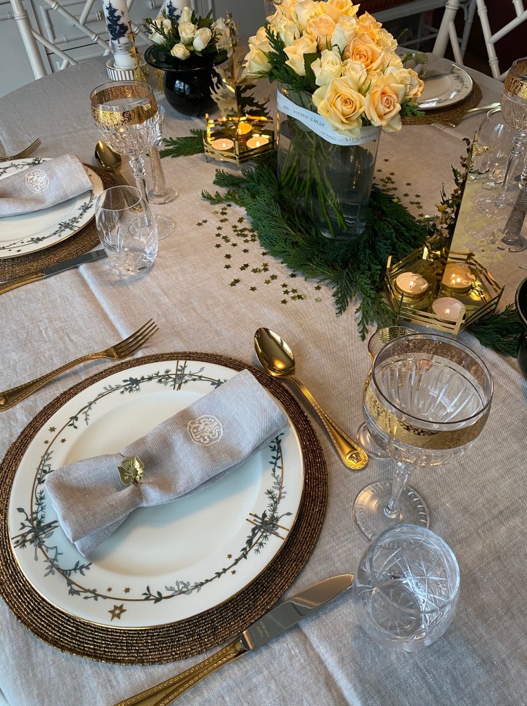 Førjulsmiddag med gode venner. Igjen samme duk og servietter, 20 års gamle gull dekkebrikker, gull bestikk, glass med gulldekor, tuia kvister og gullstjerner strødd oppå duken. Pastell roser på bordet.. gull juletre fra Jette F. Serviettringer laget av litt julepynt.