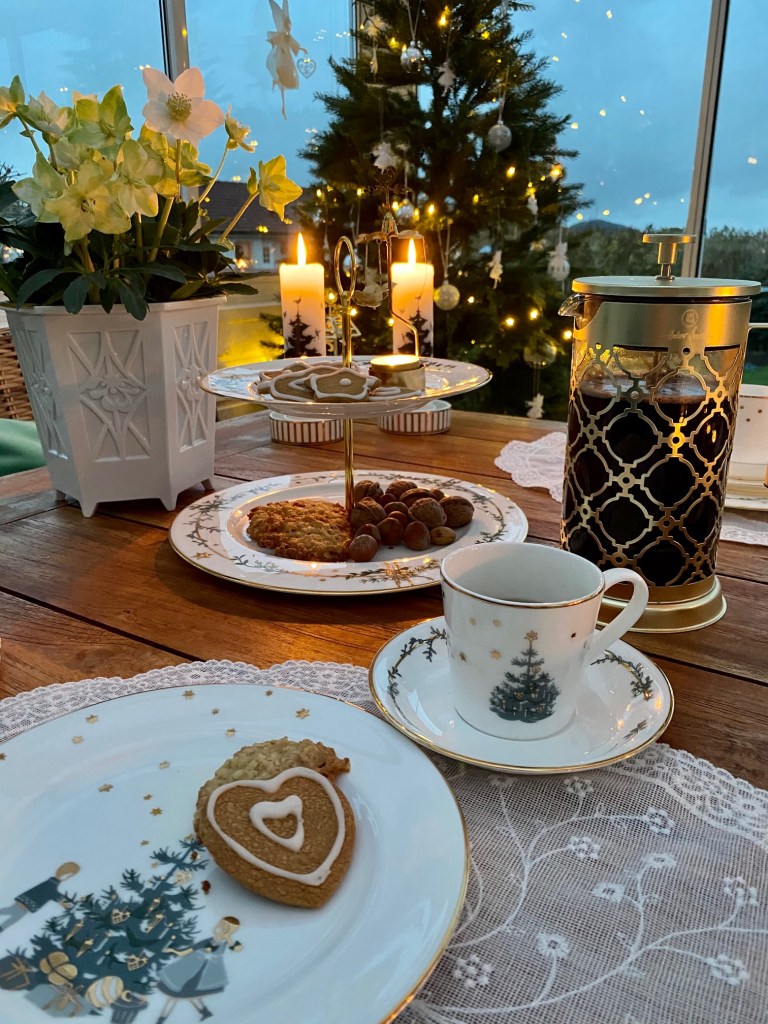 Julebaksten er på plass, og nytes ute i hagestuen.. Her er Vinterstjerne sitt kaffeservise og etasjefat. Kaffe traktekanne fra Magnor og Halvor Bakke.
