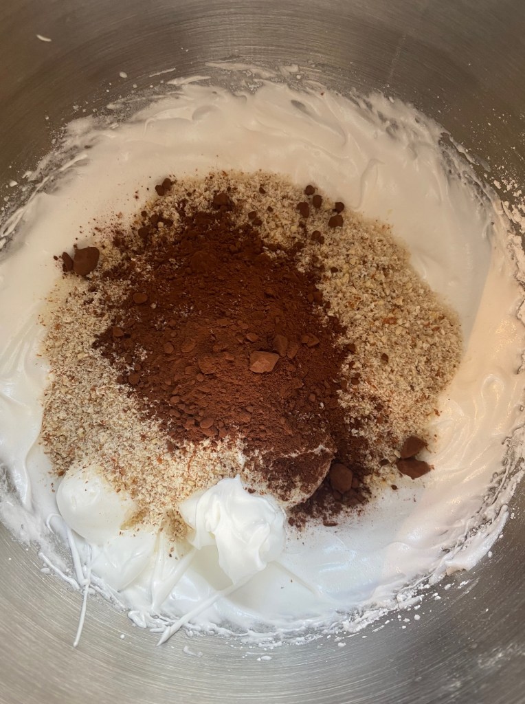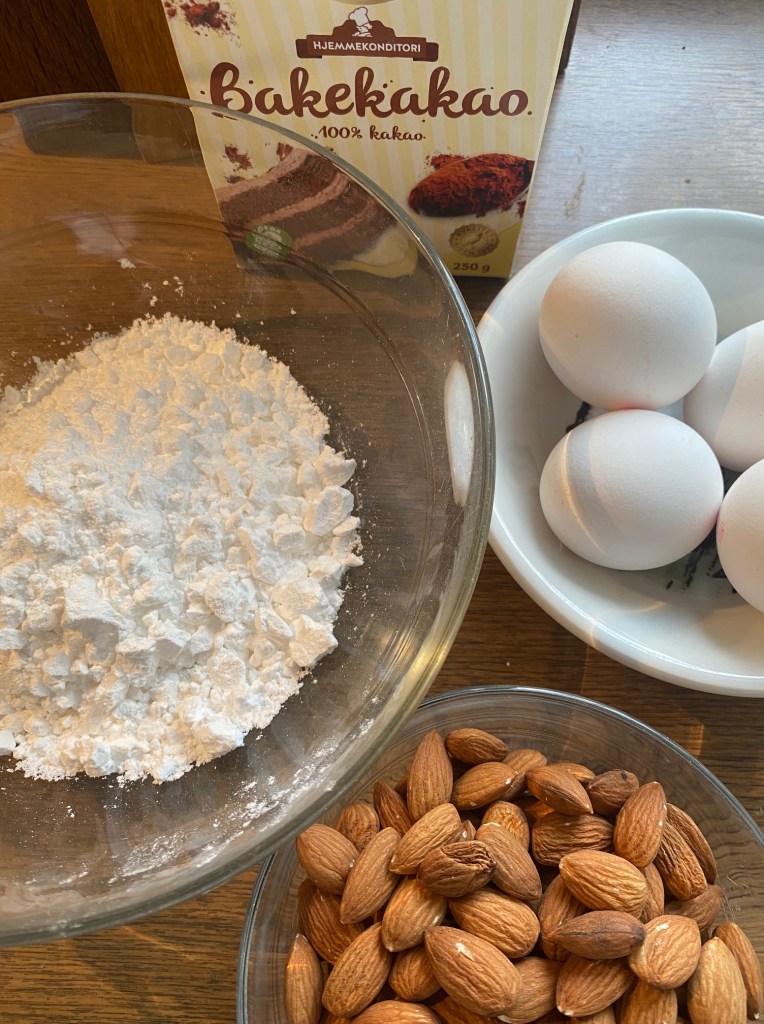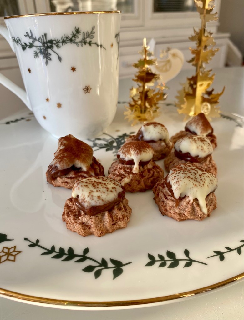 Få ingredienser til kakene.Stivpisk eggehvitene, tilsett melis litt om gangen, og visp til du får en seig masse. Vend inn malte mandler pluss bakekakao.Bruk en passende kakesprøyte, og fordel deigen ut i små topper. Stek på 180 grader i ca 11 minutt. Fordel de ferdigstekte/avkjølte kakene i en passe form, putt i fryseren i ca 1 time.Fyll opp kakesprøyten med sjokoladekrem, fordel ut slik bilde viser, putt tilbake til fryseren igjen, ca 1 time.Smelt den hvite sjokoladen, dypp en og en kake, siden kakene er frosne stivner sjokoladen fort. Dryss litt bakekakao over tilslutt. Dekk formen med folie, putt i fryseren, ta opp etter behov. Kakene tiner på 10 minutt.