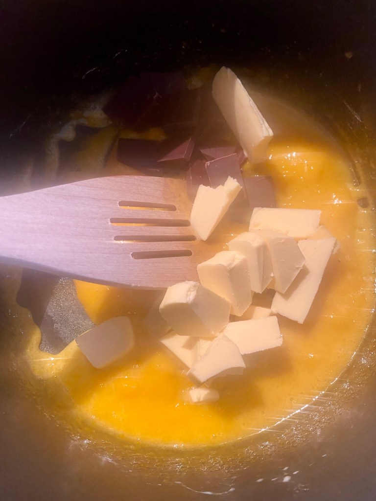 Visp sammen eggeplommer, sukker, maizena og fløte, kok forsiktig opp under omrøring til kremen tykner, trekk kasserolle tilsides, tilsett mykt smør og sjokolade, rør til alt smelter, tilslutt smakes kremen til med vaniljesukker og salt. Avkjøl ved å sette kasserollen i kaldt vann, rør om inni mellom under avkjøling.Hvit topping. 1 plate hvit sjokolade 100 gram, pluss 1sps delfiafett.
