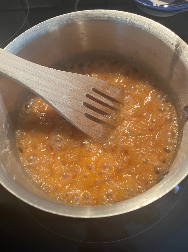 Fremgangsmåte karamellsaus : Rør sammen vann og sukker, kok på høy hastighet uten å røre, til du ser det blir gyllent, senk varmen til det halve, ha i smør og salt, tilslutt tilsettes fløten litt av gangen, la karamellen småkoke i 5 minutt. OBS ikke forlat kasserollen, og bruk kasserolle uten belegg.