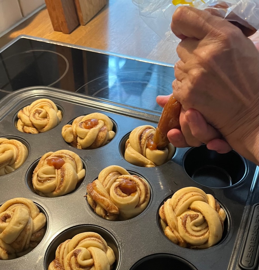 Denne oppskrift på gjærdigen bruker jeg i flere oppskrifter på denne bloggen, forskjell denne gang er at jeg bruker mindre gjær og hever 2 ganger. Fremgangsmåte og bruk av muffinsbrett til steking, fikk jeg fra den kjente matblogger Ida Gran Jansen, samme med karamellsaus. Snurrene ble veldig saftige, den salte karamell gir en fantastisk smak sammen med kanelsmør. Denne oppskrift gir 12 stk, bare å doble etter eget ønske. Utmerket å fryse.