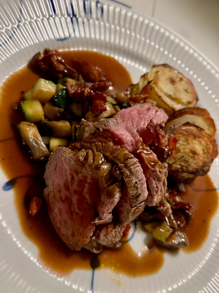 Jeg serverte disse til helstekt kalv Indrefilet, sammen med et garnitur som bestod av, hakket champinjong, paprika, squasj pluss sprøstekt bacon, en god peppersaus passet utmerket til.