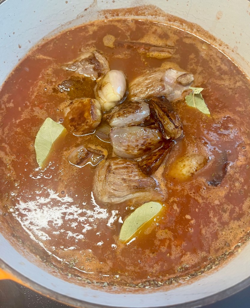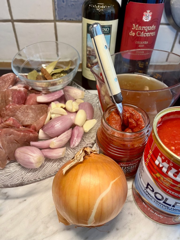 Les oppskrift, og finn frem alle ingredienser, lammekjøtt etter hva en har, jeg brukte lårskiver, som ble skåret i store biter.Start med å ha litt olivenolje pluss en klatt smør i en jerngryte, brun på alle kanter, legg kjøtet tilsides i en skål, brun så sjalottløk, eller småløk.. legg sammen med kjøttbitene.Finn frem en høy jerngryte som retten gjøres ferdig i. (Her en Le Creuset gryte) tilsett litt olivenolje, småsurr finhakket løk og hvitløk, og mykne på middels varme noen minutter. Vend inn tomatpure og sukker, la dette småsurre i ca 2-3 minutter.Tilsett så rødvinen, og la dette småkoke i ca 3minutt. Deretter har du tomatene i, pluss krydder og kraft, gis et lite oppkok.Legg så i det forhåndstekte kjøtt og sjalottløk, lauvbærblad pluss kanelstang,legg på lokk, sett i forvarmet stekeovn på 150 grader, la dette småputre der i ca 3,5 timer.