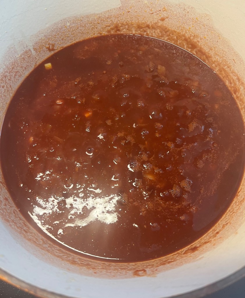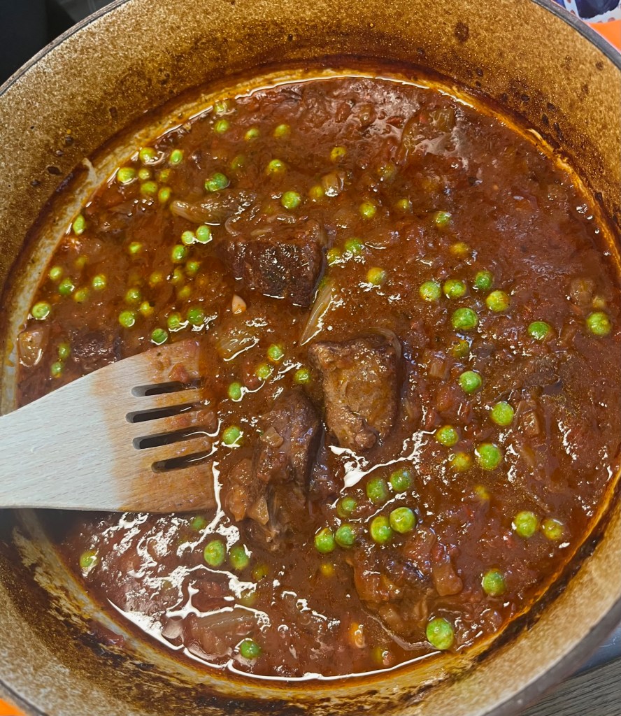 Her er Lammegryta etter 3,5 timer i stekeovn, tykk fin saus med mye smak. Jeg valgte å tilsette 100 gram hermetiske erter før servering, mest for fargen. Bruk gjerne hakket persille også.