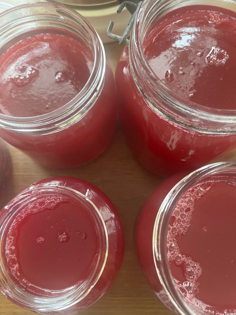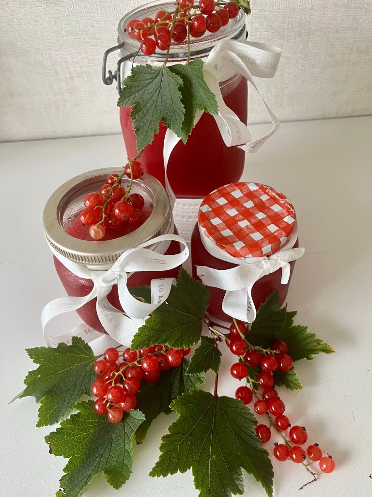 Her 2,5 kg bær, og 5 dl vann, la dette småkoke i ca 35 minutt, sil fra bærene, i et klede elle finmasket sil. Mål opp saft, ha over i ren kjele, kok opp, skum av toppen, la dette småkoke i ca3 minutt, tilsett 750 gram sukker pr liter saft, småkok så i ca 30 minutt.. uten lokk, etter 15 minutt press en chili uten frø gjennom en hvitløks presse.. etter 30 minutt smak til med sitronsaft, sil så den ferdige saften, og hell over på rene glass. Nå er gelé sikt, helles over på rene glass, la stå uten lokk med et kjøkkenhåndkle over, til de har kjølnet, skru på lokk, sett kaldt. Klar til servering, bruk glass du har tilgjengelig, eller kjøp små glass, pynt med en sløyfe, ha som vertinne gaver.