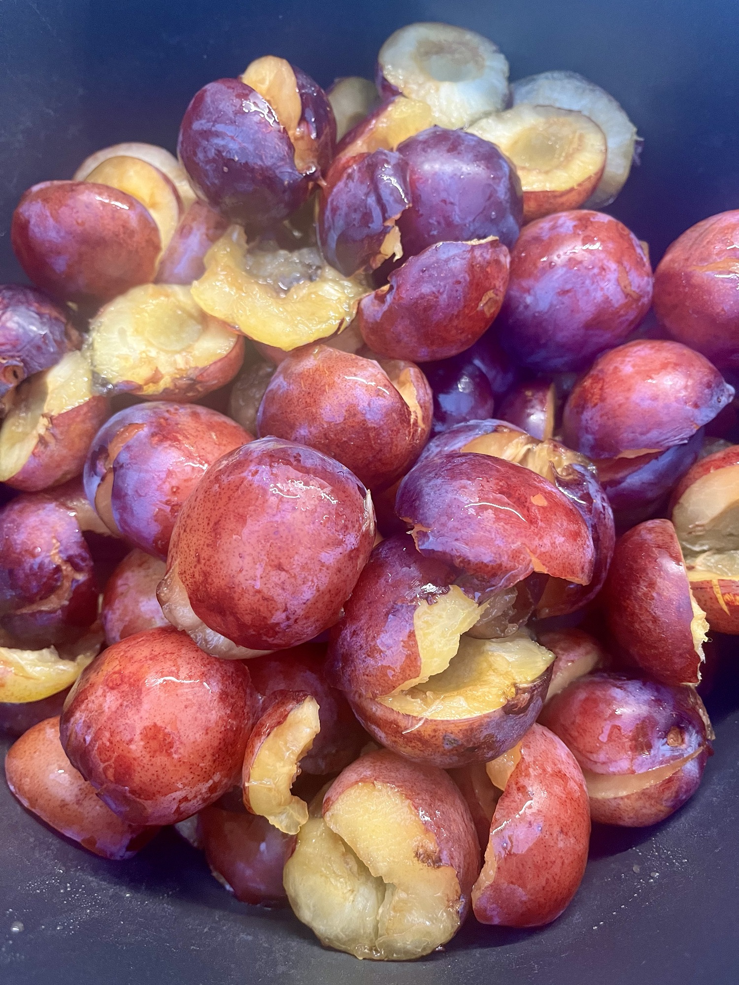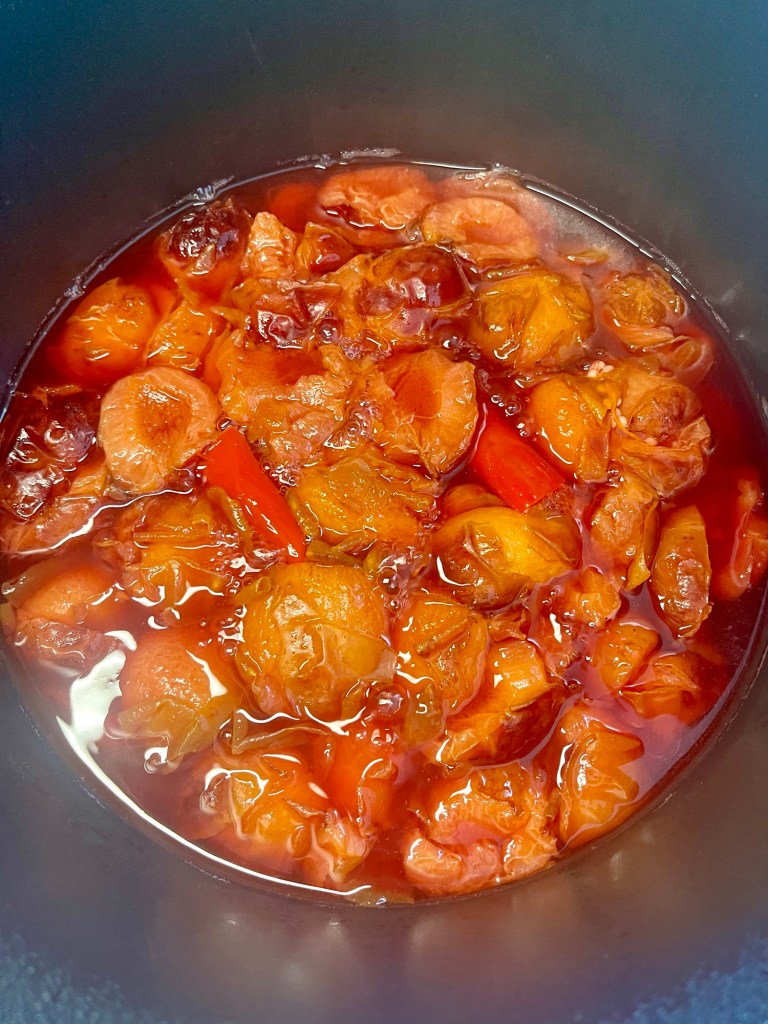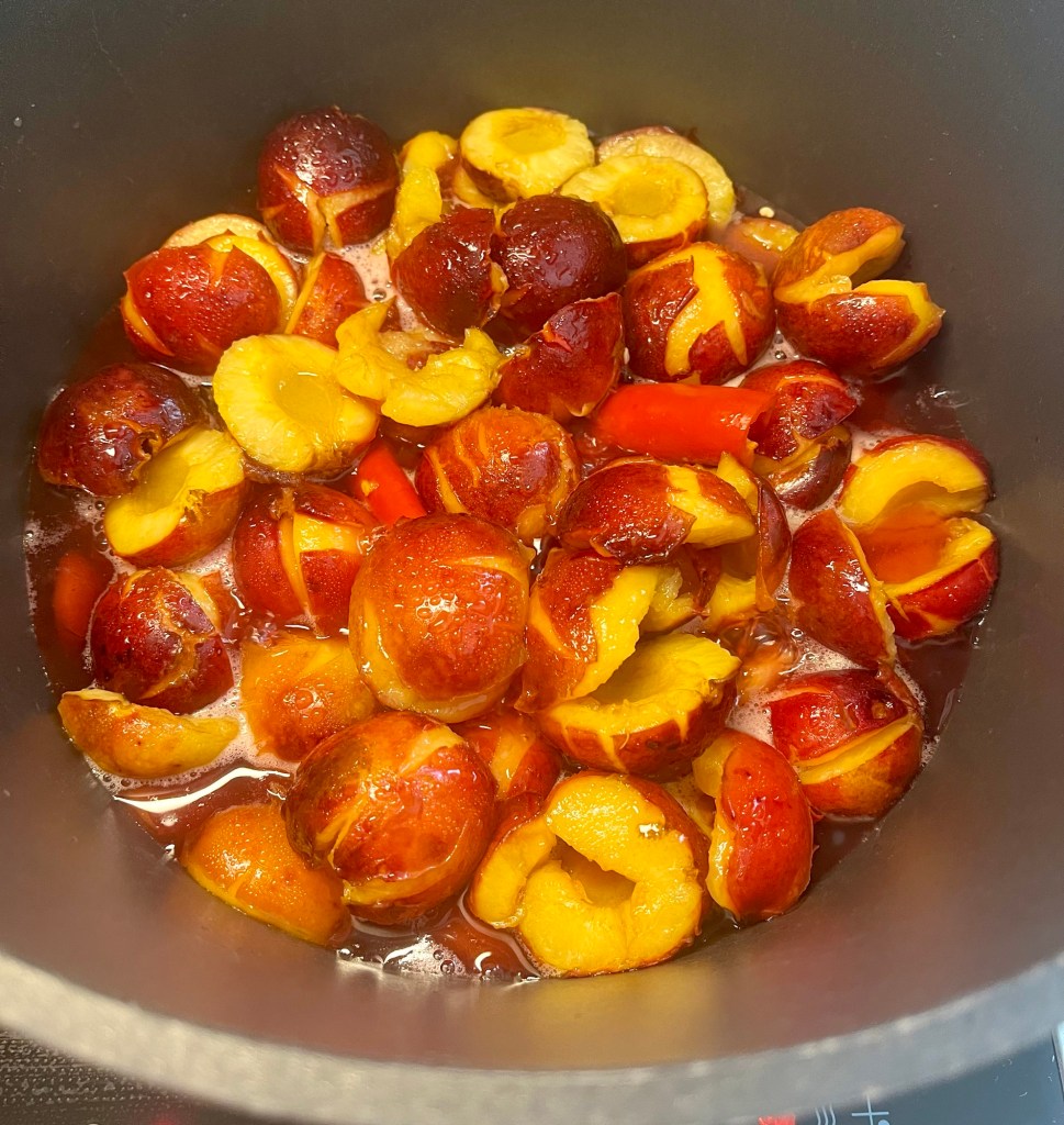 Høstens allsidige frukt, plommer, er klar for å høstes . Kan brukes til saft, syltetøy og gelé slik som her. Gele’en er utmerket til ost og kjeks, brødskiva, pluss vafler. Chili smaken regulerer du selv. Jeg fjernet 50% av chili stenene.