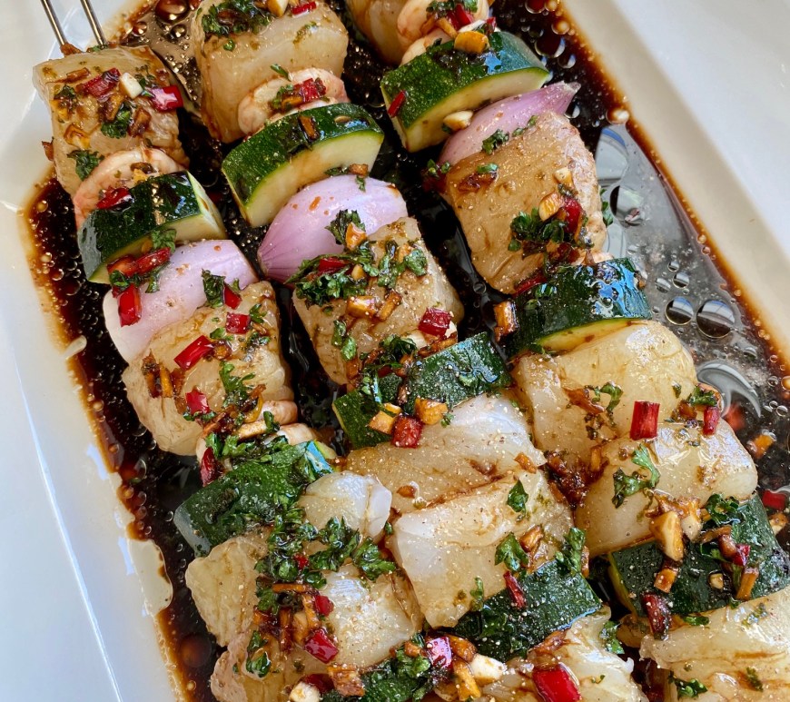 Vår, pluss sommer og sol betyr uteliv og grilling. Denne gang brukt på grillspyd med kveite.. kan brukes til all hvit, fast fisk.. også til hele fiskestykker på grillen, eller i en stekepanne. Marinaden kan lages i god tid på forhånd.. has over fisken 15 minutter før grilling. Her servert med ris, mango/vårløk/sweetchili dressing, som fikk noen dråper limesaft på toppen.. sausen heter sauce nage, … Fortsett å lese Marinade til grillet fisk.